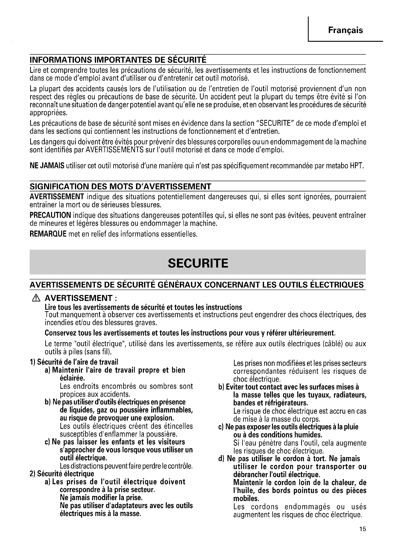 Lire et comprendre toutes les précautions de sécurité, les avertissements et les instructions de fonctionnement dans ce mode d’emploi avant d’utiliser ou d’entretenir cet outil motorisé. La plupart des accidents causés lors de l’utilisation ou de l’entretien de l’outil motorisé proviennent d’un non respect des règles ou précautions de base de sécurité. Un accident peut la plupart du temps être évité si l’on reconnaît une situation de danger potentiel avant qu’elle ne se produise, et en observant les procédures de sécurité appropriées. Les précautions de base de sécurité sont mises en évidence dans la section “SECURITE” de ce mode d’emploi et dans les sections qui contiennent les instructions de fonctionnement et d’entretien. Les dangers qui doivent être évités pour prévenir des blessures corporelles ou un endommagement de la machine sont identifiés par AVERTISSEMENTS sur l’outil motorisé et dans ce mode d’emploi. NE JAMAIS utiliser cet outil motorisé d’une manière qui n’est pas spécifiquement recommandée par metabo HPT.
