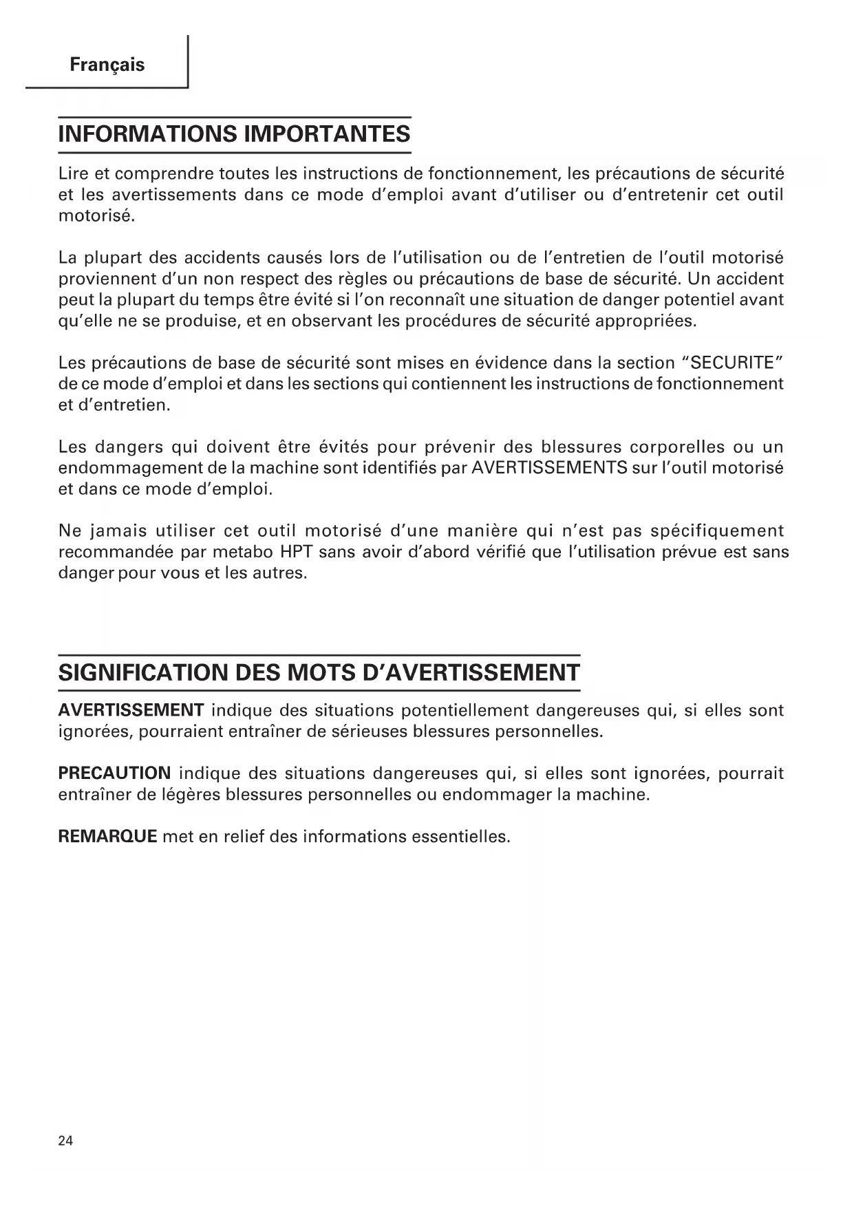 INFORMATIONS IMPORTANTES Lire et comprendre toutes les instructions de fonctionnement, les précautions de sécurité et les avertissements dans ce mode d’emploi avant d’utiliser ou d’entretenir cet outil motorisé. La plupart des accidents causés lors de l’utilisation ou de l’entretien de l’outil motorisé proviennent d’un non respect des règles ou précautions de base de sécurité. Un accident peut la plupart du temps être évité si l’on reconnaît une situation de danger potentiel avant qu’elle ne se produise, et en observant les procédures de sécurité appropriées. Les précautions de base de sécurité sont mises en évidence dans la section “SECURITE” de ce mode d’emploi et dans les sections qui contiennent les instructions de fonctionnement et d’entretien. Les dangers qui doivent être évités pour prévenir des blessures corporelles ou un endommagement de la machine sont identifiés par AVERTISSEMENTS sur l’outil motorisé et dans ce mode d’emploi. Ne jamais utiliser cet outil motorisé d’une manière qui n’est pas spécifiquement recommandée par metabo HPT sans avoir d’abord vérifié que l’utilisation prévue est sans danger pour vous et les autres.