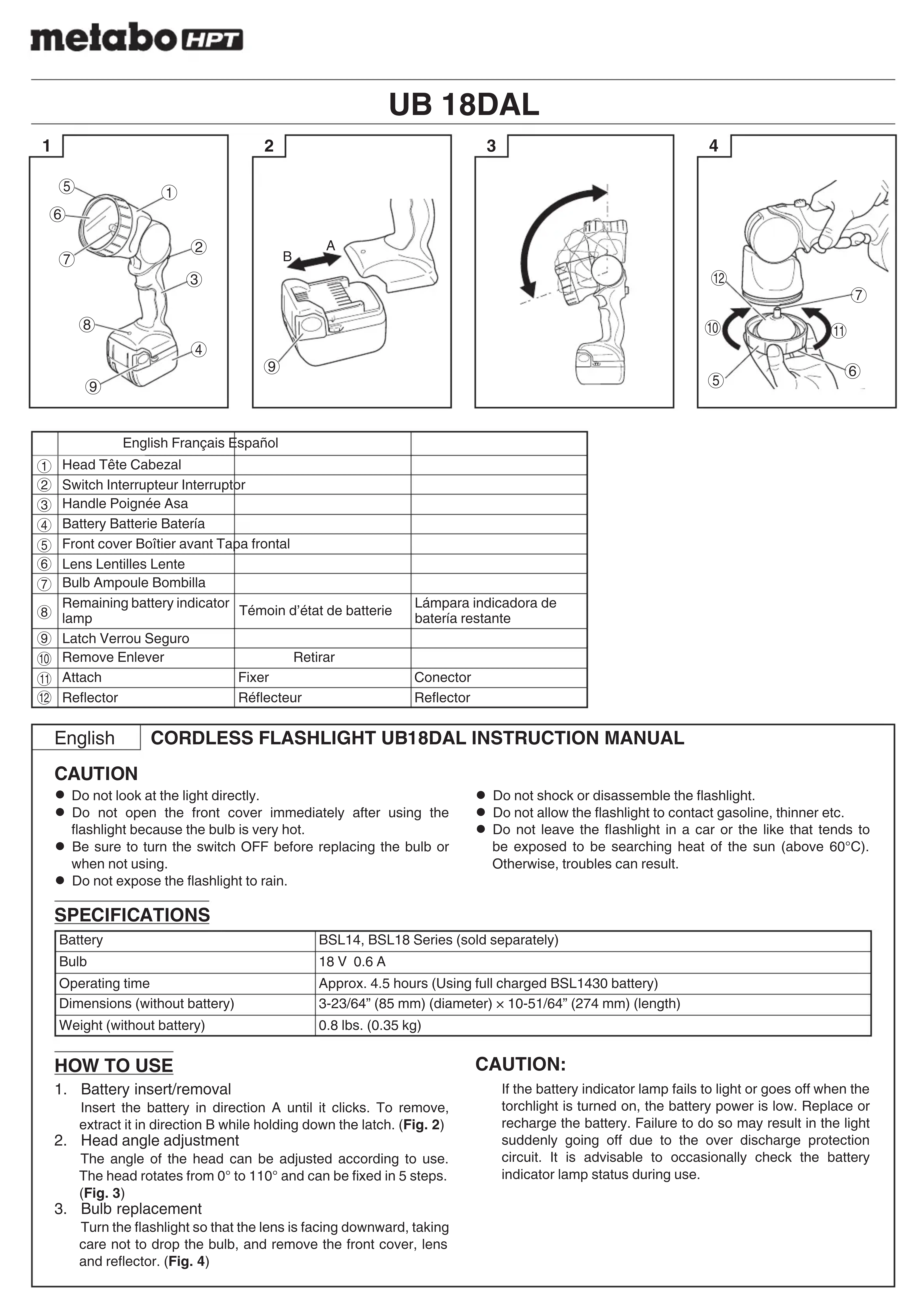 Gire la linterna de forma que la lente mire hacia abajo, teniendo cuidado de que no se caiga la bombilla y retire la cubierta delantera, la lente y el refl ector. (Fig. 4) Si la lámpara indicadora de la batería no ilumina o se apaga cuando la linterna se enciende, la potencia de la batería es baja. Sustituya o recargue la batería. De lo contrario la luz podría irse en cualquier momento debido al circuito de protección de sobre-descarga. Se aconseja comprobar de vez en cuando el estado de la lámpara indicadora de la batería durante su uso. Español MANUAL DE INSTRUCCIONES DE LA LINTERNA A BATERÍA UB18DAL ADVERTENCIA: ATTENTION ● Ne pas regarder directement la lumière. ● Ne pas ouvrir le boîtier avant immédiatement après avoir utilisé le projecteur, car l’ampoule est très chaude. ● S’assurer d’éteindre le projecteur avant de remplacer l’ampoule et lorsqu’il n’est pas utilisé. ● Ne pas exposer le projecteur à la pluie. ● Ne pas cogner ni démonter le projecteur. ● Ne pas mettre le projecteur en contact avec de l’essence, du dissolvant, etc. ● Ne pas laisser le projecteur dans la voiture ou autre lieu soumis à la chaleur des rayons du soleil (supérieur à 60°C). Au risque de subir des problèmes. CARACTÉRISTIQUES Batterie Série BSL14, BSL18 (vendu séparément) Ampoule 18 V 0.6 A Temps d’opération Environ 4.5 heures (en utilisant une batterie complètement chargée BSL1430) Dimensions (sans la batterie) 3-23/64” (85 mm) (diamètre) × 10-51/64” (274 mm) (longueur) Poids (sans la batterie) 0.8 lbs. (0.35 kg)