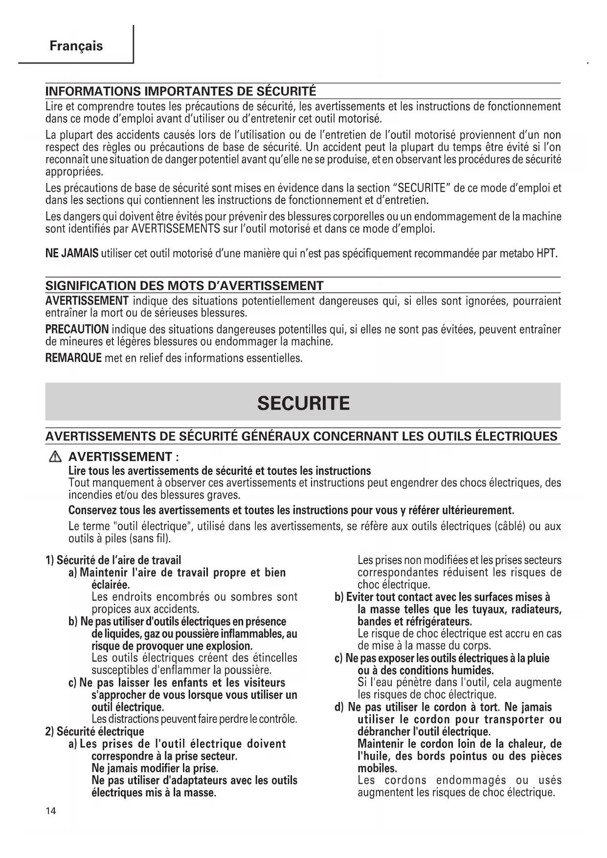 Lire et comprendre toutes les précautions de sécurité, les avertissements et les instructions de fonctionnement dans ce mode d’emploi avant d’utiliser ou d’entretenir cet outil motorisé. La plupart des accidents causés lors de l’utilisation ou de l’entretien de l’outil motorisé proviennent d’un non respect des règles ou précautions de base de sécurité. Un accident peut la plupart du temps être évité si l’on reconnaît une situation de danger potentiel avant qu’elle ne se produise, et en observant les procédures de sécurité appropriées. Les précautions de base de sécurité sont mises en évidence dans la section “SECURITE” de ce mode d’emploi et dans les sections qui contiennent les instructions de fonctionnement et d’entretien. Les dangers qui doivent être évités pour prévenir des blessures corporelles ou un endommagement de la machine sont identifiés par AVERTISSEMENTS sur l’outil motorisé et dans ce mode d’emploi. NE JAMAIS utiliser cet outil motorisé d’une manière qui n’est pas spécifiquement recommandée par metabo HPT.