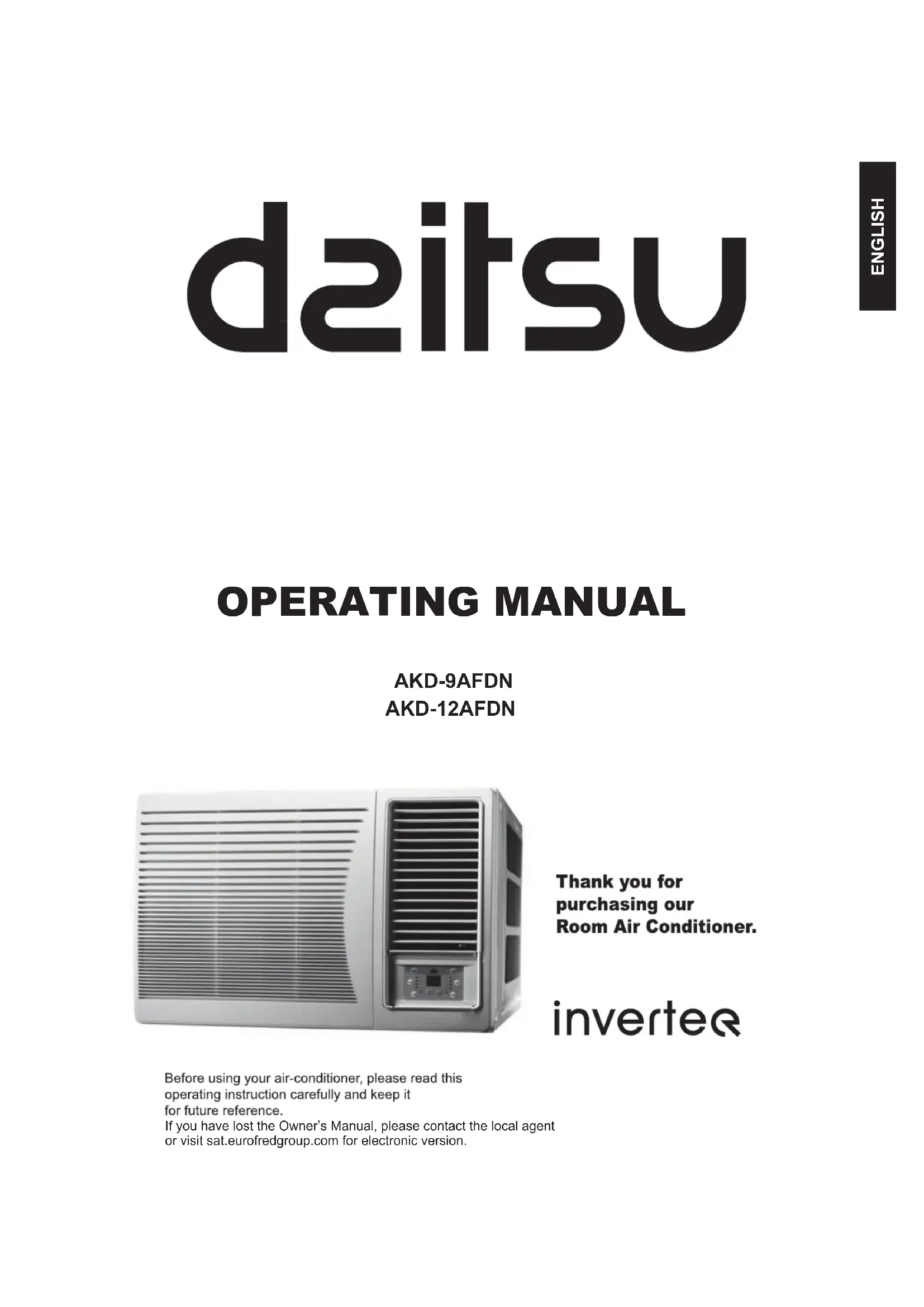 The connection between AC and power cord or among other elements Others independently shall be subject to wiring diagram on the unit. Model and rated value of fuse shall be subject to screen print on correspond- ing controller or protective bushing. The external static pressure at testing place of AC is 0MPa.FRANÇAIS MANUEL DE FONCTIONNEMENT Merci d ’avoir acheté notre climatiseur Veuillez lire ces instructions avec attention avant d’utiliser votre climatiseur et les conserver pour un usage futur. Si vous avez perdu le manuel de l'utilisateur, s'il vous plaît communiquer avec l'agent local ou visitez sat.eurofredgroup.com pour la version électronique. AKD-9AFDN AKD-12AFDN1 Précautions