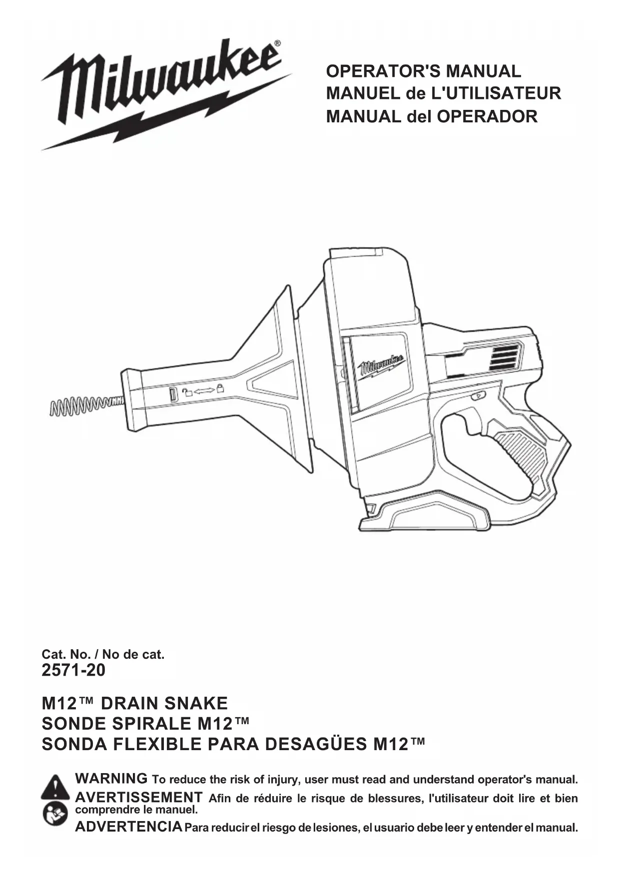 (Voir « Nettoyage des câbles, tambours et seaux » dans la section Entretien). ENTRETIEN AVERTISSEMENT Pour minimiser les risques de blessures corporelles, débranchez le chargeur et retirez la batterie du chargeur ou de l’outil avant d’y effectuer des travaux d’entretien. Ne démontez jamais l’outil, la batterie ou le chargeur. Pour toute réparation, con- sultez un centre de service MILWAUKEE accrédité. Entretien de l’outil Gardez l’outil en bon état en adoptant un programme d’entretien ponctuel. Inspectez votre outil pour des questions telles que le bruit excessif, de grippage des pièces mobiles, de pièces cassées ou toute autre condi- tion qui peut aecter le fonctionnement de l'outil. Re- tournez votre outil à un centre de service MILWAUKEE accrédité pour obtenir le service. Après une période pouvant aller de 6 mois à un an, selon l’usage, retournez votre outil à un centre de service MILWAUKEE accrédité pour d'inspection. Si l’outil ne démarre pas ou ne fonctionne pas à pleine puissance alors qu’il est branché sur une batterie com- plètement chargée, nettoyez les points de contact entre la batterie et l’outil. Si l’outil ne fonctionne toujours pas correctement, renvoyez l’outil, le chargeur et la batterie à un centre de service MILWAUKEE accrédité. AVERTISSEMENT Pour minimiser les risques de blessures ou de dom- mages à l'outil, n'immergez jamais l'outil, la batterie ou le chargeur et ne laissez pas de liquide s'y inltrer. Nettoyage Débarrassez les évents des débris et de la poussière. Gardez les poignées propres, à sec et exemptes d’huile ou de graisse. Le nettoyage doit se faire avec un linge humide et un savon doux. Certains nettoyants tels l’essence, la térébenthine, les diluants à laque ou à peinture, les solvants chlorés, l’ammoniaque et les détergents d’usage domestique qui en contiennent pourraient détériorer le plastique et l’isolation des pièces. Ne laissez jamais de solvants inammables ou combustibles auprès des outils. Nettoyage des câbles, tambours et seaux Rincer soigneusement à l'eau les câbles, tambours et seaux après chaque utilisation pour prévenir les eets néfastes des sédiments et des composés de nettoyage des canalisations. AVERTISSEMENT! Toujours porter gants sur du latex ou des gants en caoutchouc pour éviter l'enchevêtrement. Après le lavage, sécher com- plètement le câble et le tambour. Ensuite, essuyer le câble avec un chion huilé avant de le remettre dans le tambour selon les instructions gurant dans la section « Installation du câble ».11 Réparations Pour les réparations, retournez outil, batterie et chargeur en entier au centre-service autorisé le plus près. ACCESOIRES AVERTISSEMENT L’utilisation d’autres acces- soires que ceux qui sont spéciquement recommandés pour cet outil peut comporter des risques. Pour une liste complète des accessoires, visiter le site internet www.milwaukeetool.com ou contactez un distributeur.