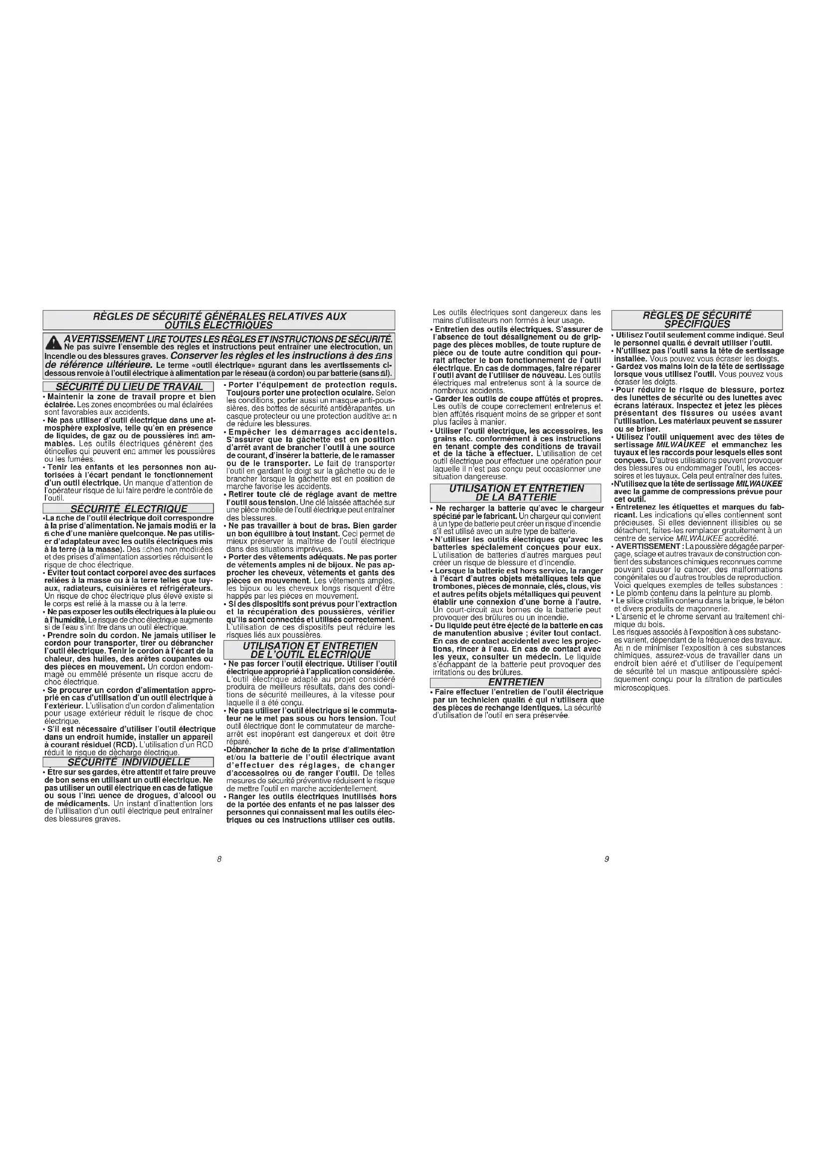 - Vérifi cation du fonctionnement électromécanique Si l’outil ne démarre pas ou ne fonctionne pas à pleine puissance alors qu’il est branché sur une batterie complètement chargée, nettoyez les points de contact entre la batterie et l’outil. Si l’outil ne fonctionne toujours pas correctement, renvoyez l’outil, le chargeur et la batterie à un centre de ser- vice MILWAUKEE accrédité, afi nqu’on en effectue la réparation (voir “Réparations”). Nettoyage Débarrassez les évents du chargeur et de l’outil des débris et de la poussière. Gardez les poignées de l’outil propres, à sec et exemptes d’huile ou de graisse. Le nettoyage de l’outil, du chargeur et de la batterie doit se faire avec un linge humide et un savon doux. Certains nettoyants tels l’essence, la térébenthine, lesdiluants à laque ou à peinture, les solvants chlorés, l’ammoniaque et les détergents d’usage domestique qui en contiennent pourraient détériorer le plastique et l’isolation des pièces. Ne laissez jamais de solvants infl ammables ou com- bustibles auprès de l’outil. Réparations Pour les réparations, retournez outil, batterie et chargeur en entier au centre-service le plus près. ENTRETIEN AVERTISSEMENT Pour minimiser les risques de blessures corporelles, dé- branchez le chargeur et retirez la batterie du chargeur ou de l’outil avant d’y effectuer des travaux d’entretien. Ne démontez jamais l’outil, la batterie ou le chargeur. Pour toute réparation, consultez un centre de service MILWAUKEE accrédité. AVERTISSEMENT Pour minimiser les risques de blessures ou de dommages à l'outil, n'immergez jamais l'outil, la batterie ou le chargeur et ne laissez pas de liquide s'y infi ltrer. ACCESOIRES AVERTISSEMENT Retirez toujours la batterie avant de changer ou d’enlever les ac- cessoires. L’utilisation d’autres accessoires que ceux qui sont spécifi quement recomman- dés pour cet outil peut comporter des risques. Pour une liste complète des accessoires, prière de se reporter au catalogue MILWAUKEE Electric Tool ou visiter le site internet www.milwaukeetool.com. Pour obtenir un catalogue, il suffi t de contacter votre distributeur local ou l'un des centres-service. GARANTIE LIMITÉE - AUX ÉTATS-UNIS ET AU CANADA TECHTRONIC INDUSTRIES' garantit le produit pendant cinq ans à partir de la date d’achat d’origine. Le présent bon de garantie couvre tous les vices de matériau et de fabrication que peut affi cher cet outil électrique. Pour assurer la validité de la présente garantie, veuillez présenter le bon de commande, estampillé du sceau du distributeur ou du magasin où le produit a été acheté, au centre de réparations agréé. Si le bon de commande n’a pas été estampillé, veuillez fournir la preuve d’achat d’origine au centre de réparations agréé. Pour un entretien, des pièces, des acces- soires ou d’autres composants, composer sans frais le 1-800-832-1949 afi n d’obtenir les coordonnées du centre de réparations agréé le plus près. Procédure pour assurer la validité de la garantie Présenter le produit au centre de réparations agréé, accompagné du bon de commande estampillé du sceau du distributeur ou du magasin où le produit a été acheté. Toute pièce défectueuse ou tout composant défectueux sera remplacé sans frais. Milwaukee assume tous les frais de transport liés à ce processus de garantie. Exceptions La garantie ne s’applique pas dans les situations suivantes : a) Si le produit a été utilisé pour une fi n autre que celle indiquée dans le guide de l’utilisateur fi nal ou le manuel d’instructions. b) Si les conditions d’utilisations ne sont pas habituelles. c) Si le produit a été modifi é ou réparé par une personne non autorisée par TECHTRONIC INDUSTRIES. Note : Si le cordon électrique est endommagé, il doit être remplacé par un centre de réparations agréé pour éviter les risques d’électrocution. CENTRE DE RÉPARATIONS ET DE SERVICE Av Presidente Mazarik 29 Piso 7, 11570 Chapultepec Morales Miguel Hidalgo, Distrito Federal, Mexico Ph. 52 55 4160-3547 IMPORTÉ ET COMMERCIALISÉ PAR : TECHTRONIC INDUSTRIES MEXICO, .S.A. DE C.V. Av Presidente Mazarik 29 Piso 7, 11570 Chapultepec Morales Miguel Hidalgo, Distrito Federal, Mexico GARANTIE LIMITÉE – MEXIQUE, AMÉRIQUE CENTRALE ET CARAÏBES Modèle : Date d’achat : Sceau du distributeur ou du magasin : Chaque outil électrique MILWAUKEE (y compris les produits sans fi l [outils, piles, chargeur de piles, lampe de travail]; consulter les énoncés de la GARANTIE LIMITÉE DES BLOCS-PILES SANS FIL) est garanti à l’acheteur d’origine être exempt de vice de matériau et de fabrication. Sous réserve de certaines exceptions, MILWAUKEE réparera ou remplacera toute pièce d’un outil électrique qui, après examen par MILWAUKEE, s’est avérée être affectée d’un vice de matériau ou de fabrication pendant une période de cinq (5) ans* après la date d’achat, sauf indication contraire. Retourner l’outil électrique, à un centre de réparations en usine MILWAUKEE ou à un poste d’entretien agréé MILWAUKEE, en port prépayé et assuré. Une copie de la preuve d’achat doit être présentée au moment de retourner le produit. Cette garantie ne couvre pas les dommages que MILWAUKEE détermine être causés par des réparations ou des tentatives de réparation par quiconque autre que le personnel agréé par MILWAUKEE, des utilisations incorrectes, des altéra- tions, des utilisations abusives, une usure normale, une carence d’entretien ou des accidents. *La période de garantie applicable pour les radios de chantier, le port d’alimentation M12™, Source d'énergie M18™, et les chariots de travail industriels Trade Titan™ est d’une durée d’un (1) an à partir de la date d’achat. La période de la garantie couvrant la lampe de travail à DÉL et l’ampoule améliorée à DÉL est une garantie À V