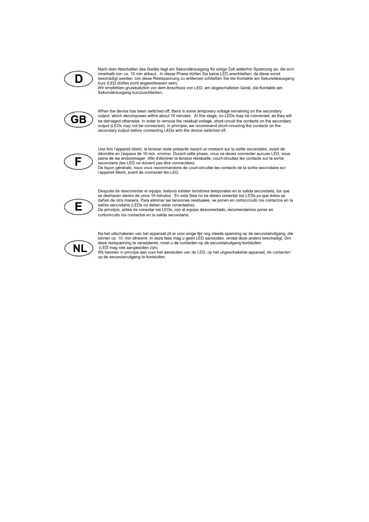 Une fois l’appareil éteint, la tension reste présente durant un moment sur la sortie secondaire, avant de décroître en l’espace de 10 min. environ. Durant cette phase, vous ne devez connecter aucune LED, sous peine de les endommager. Afin d’éliminer la tension résiduelle, court-circuitez les contacts sur la sortie secondaire (les LED ne doivent pas être connectées). De façon générale, nous vous recommandons de court-circuiter les contacts de la sortie secondaire sur l’appareil éteint, avant de connecter les LED.