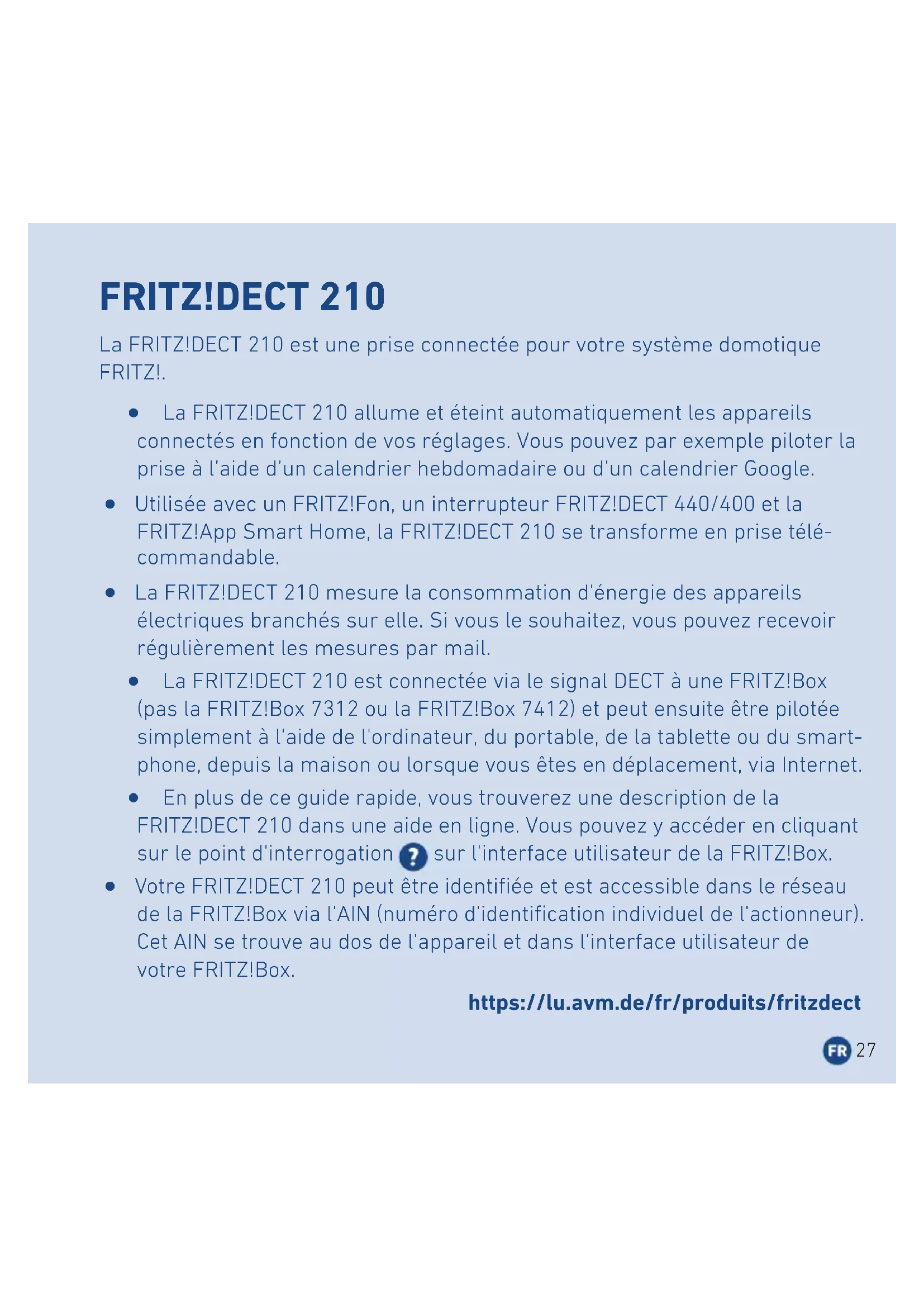 FRITZ!DECT210 is registered with your FRITZ!Box. ashing Software update or registration in progress ashes brie y at regular intervals FRITZ!DECT210 is not connected with your FRITZ!Box (not registered, or outside the DECT range) 25Legal Notice Conformity Declaration of Conformity AVM hereby declares that the device is compliant with the Directive 2014/53 / EU. UKCA Declaration of Conformity AVM hereby declares that the device is compliant with the Radio Equipment Regulations 2017 (S.I. 2017/1206). The full text of the declarations of conformity is available at https://en.avm.de/service/declarations. Disposal In accordance with European directives, FRITZ!DECT210 may not be disposed with household waste. Please bring the device to a local collection point for disposal after use. Manufacturer’s Warranty We oer a manufacturer’s warranty of 2 years for this original product. The warranty period begins with the date of purchase by the rst end user. Compliance with the warranty period can be proven by submission of the original invoice or comparable documents. This warranty does not restrict your warranty rights based on the contract of sale or other statutory rights. Within the warranty period, we will remove defects to the product which are demonstrably due to faults in materials or manufacturing. Our warranty does not cover defects which occur due to incorrect installation, improper use, non-observance of instructions in the user manual, normal wear and tear or defects in the environment of the system (third-party hardware or software). We may, at our discretion, repair or replace the defective product. Claims other than the right to the removal of defects which is mentioned in these terms of warranty are not constituted. We guarantee that the software conforms with general specications, not, however, that the software meets your individual requirements. Delivery costs will not be reimbursed. Products which have been replaced revert to our ownership. Claims recognized under warranty entail neither an extension or recommencement of the warranty period. If we reject a warranty claim, this claim lapses no later than six months after being rejected by us. This warranty shall be governed by German substantive law, to the exclusion of the United Nations Convention on Contracts for the International Sale of Goods (CISG). 26FRITZ!DECT210 La FRITZ!DECT210 est une prise connectée pour votre système domotique FRITZ!. ˊ La FRITZ!DECT210 allume et éteint automatiquement les appareils connectés en fonction de vos réglages. Vous pouvez par exemple piloter la prise à l’aide d’un calendrier hebdomadaire ou d’un calendrier Google. ˊ Utilisée avec un FRITZ!Fon, un interrupteur FRITZ!DECT440/400 et la FRITZ!AppSmartHome, la FRITZ!DECT210 se transforme en prise télé- commandable. ˊ La FRITZ!DECT210 mesure la consommation d'énergie des appareils électriques branchés sur elle. Si vous le souhaitez, vous pouvez recevoir régulièrement les mesures par mail. ˊ La FRITZ!DECT210 est connectée via le signal DECT à une FRITZ!Box (pas la FRITZ!Box7312 ou la FRITZ!Box7412) et peut ensuite être pilotée simplement à l'aide de l'ordinateur, du portable, de la tablette ou du smart- phone, depuis la maison ou lorsque vous êtes en déplacement, via Internet. ˊ En plus de ce guide rapide, vous trouverez une description de la FRITZ!DECT210 dans une aide en ligne. Vous pouvez y accéder en cliquant sur le point d'interrogation sur l'interface utilisateur de la FRITZ!Box. ˊ Votre FRITZ!DECT210 peut être identiée et est accessible dans le réseau de la FRITZ!Box via l'AIN (numéro d'identication individuel de l'actionneur). Cet AIN se trouve au dos de l'appareil et dans l'interface utilisateur de votre FRITZ!Box. https://lu.avm.de/fr/produits/fritzdect 27Sécurité ˊ Ne soumettez pas la FRITZ!DECT210 à une puissance supérieure à 3450W/15A (charge résistive). Une surcharge peut endommager la FRITZ!DECT210, causer des dysfonctionnements ou provoquer un accident électrique. ˊ Utilisez la FRITZ!DECT210 sur une prise facilement accessible, dans un endroit susamment aéré et sans exposition directe aux rayons du soleil. ˊ N'exposez jamais la FRITZ!DECT210 directement à des jets d'eau ou à la pluie. La FRITZ!DECT210 est protégée contre les projections d'eau selon IP44. La protection contre les projections d’eau IP44 existe uniquement si les composants impliqués, la che électrique et la prise de courant élec- trique, ont la même classe de protection. ˊ Ne branchez pas plusieurs FRITZ!DECT210 les unes dans les autres. ˊ Ne branchez aucun appareil présentant un risque d'incendie (fer à repas- ser, radiateur infrarouge, grill électrique,etc.) sans surveillance sur une FRITZ!DECT210. ˊ Ne modiez pas la FRITZ!DECT210. Veillez à ne pas ouvrir, transformer, modier ou réparer de façon inappropriée la FRITZ!DECT210. ˊ Ne congurez une (dés)activation automatique pour la FRITZ!DECT210 que si les appareils branchés sont conçus pour un tel usage. Éteindre et allumer un appareil électroménager trop fréquemment peut en écourter la durée de vie. Aucune garantie n'est oerte pour des dommages de ce type sur des appareils connectés. 28Contenu du pack Désignation Illustration 1 FRITZ!DECT210 On/Off DECT 1 guide rapide sans illustration Données techniques ˊ Norme radio: DECT ˊ Plage de fréquences: 1880MHz – 1902MHz ˊ Puissance de transmission max.: 250mW ˊ Portée: jusqu’à 40m dans les bâtiments, jusqu’à 300m à l’extérieur ˊ Puissance e ective max.: env. 1,5W ˊ Puissance active en mode veille: env. 0,4W ˊ Précision des mesures: +/- 100mW (jusqu'à 5W) +/- 2% (à partir de 5W) ˊ 230V, 50Hz CA ˊ Dimensions (sans prise): 65x 127x 36mm ˊ Poids: environ 204g ˊ Indice de protection: IP44, protégé contre les projections d'eau ˊ Limite de puissance pour appareils connectés jusqu'à 3450W/15A ˊ Température ambiante: -20°C à +40°C ˊ Plage de température mesu