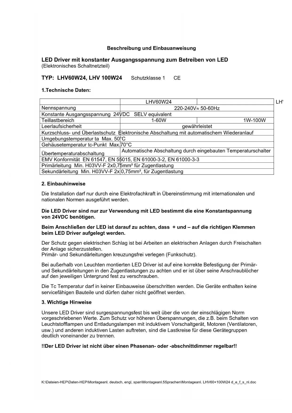 24VDCK:\Dateien-HEP\Daten-HEP\Montageanl. deutsch, engl, span\Montageanl.5Sprachen\Montageanl. LHV60+100W24 d_e_f_s_nl.doc Description et instructions de montage Pilote de diodes à tension de sortie constante pour l'utilisation de diodes (bloc d'alimentation électronique) TYPE: LHV60W24, LHV 100W24 Classe de protection 1 CE