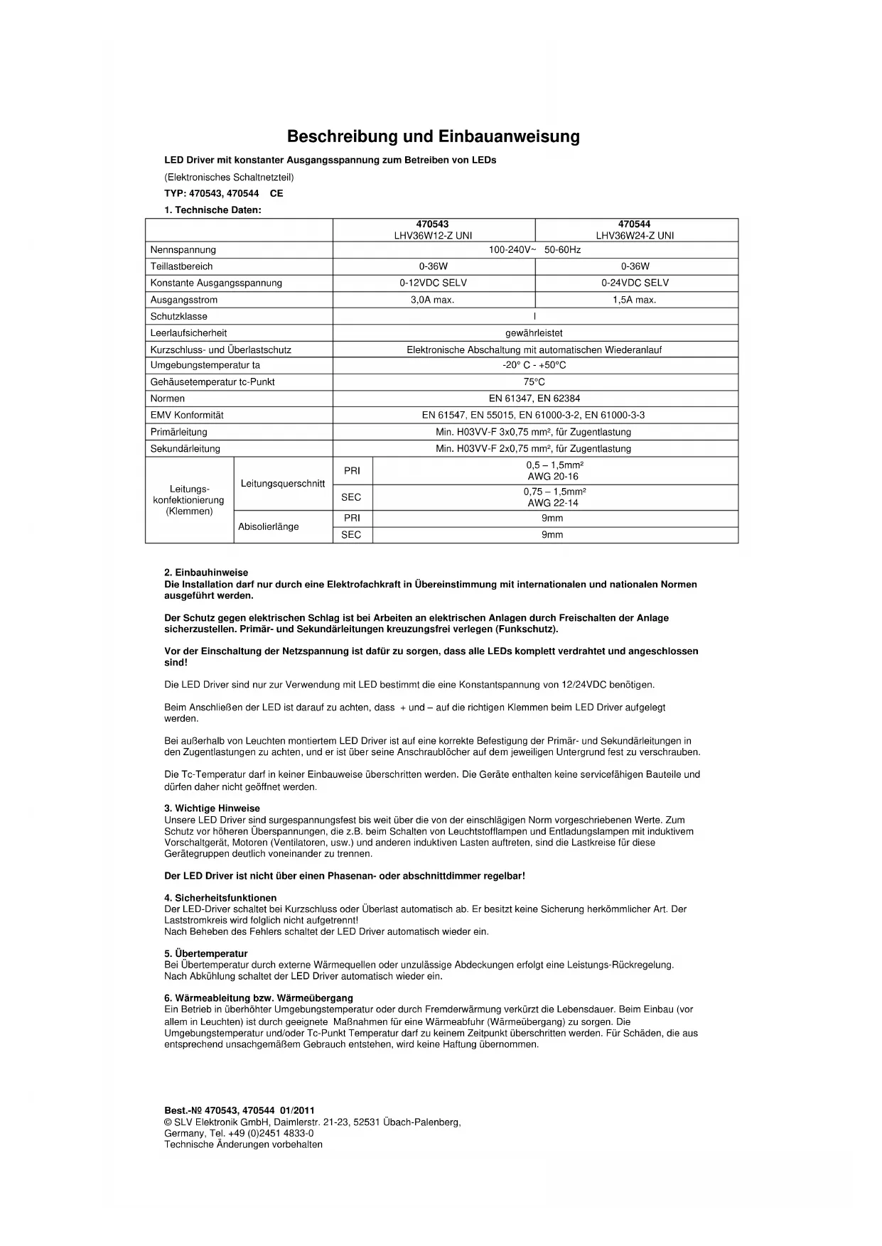 Art.-No. 470543, 470544 01/2011 © SLV Elektronik GmbH, Daimlerstr. 21-23, 52531 Übach-Palenberg, Germany, Tel. +49 (0)2451 4833-0 Technical properties subject to modificationDescription et instructions de montage Convertisseur LED à tension de sortie constante pour l'utilisation de diodes (Bloc d'alimentation électronique) TYPE : 470543, 470544 CE