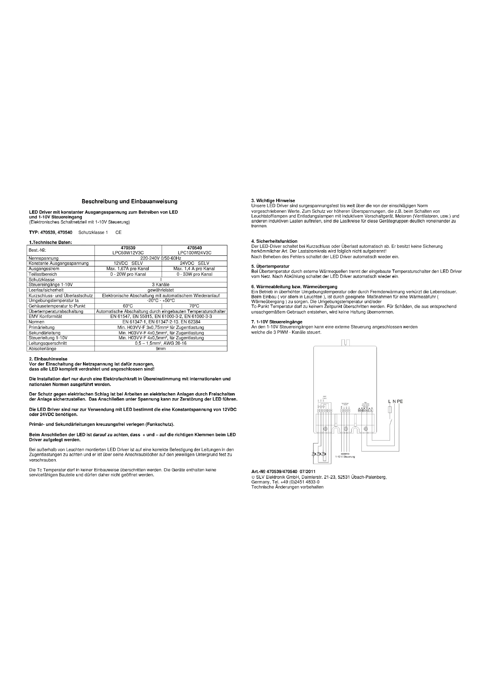 Art.-No. 470539/470540 07/2011 SLV Elektronik GmbH, Daimlerstr. 21-23, 52531 Übach-Palenberg, Germany, Tel. +49 (0)2451 4833-0 Technical properties subject to modificationDescription et instructions de montage Driveur DEL avec une tension de sortie constante pour faire fonctionner le DEL Et entrée de commande de 1-10V (Alimentation a découpage électronique avec pilotage de 1-10v) TYPE: 470539, 470540 Classe de protection 1 CE