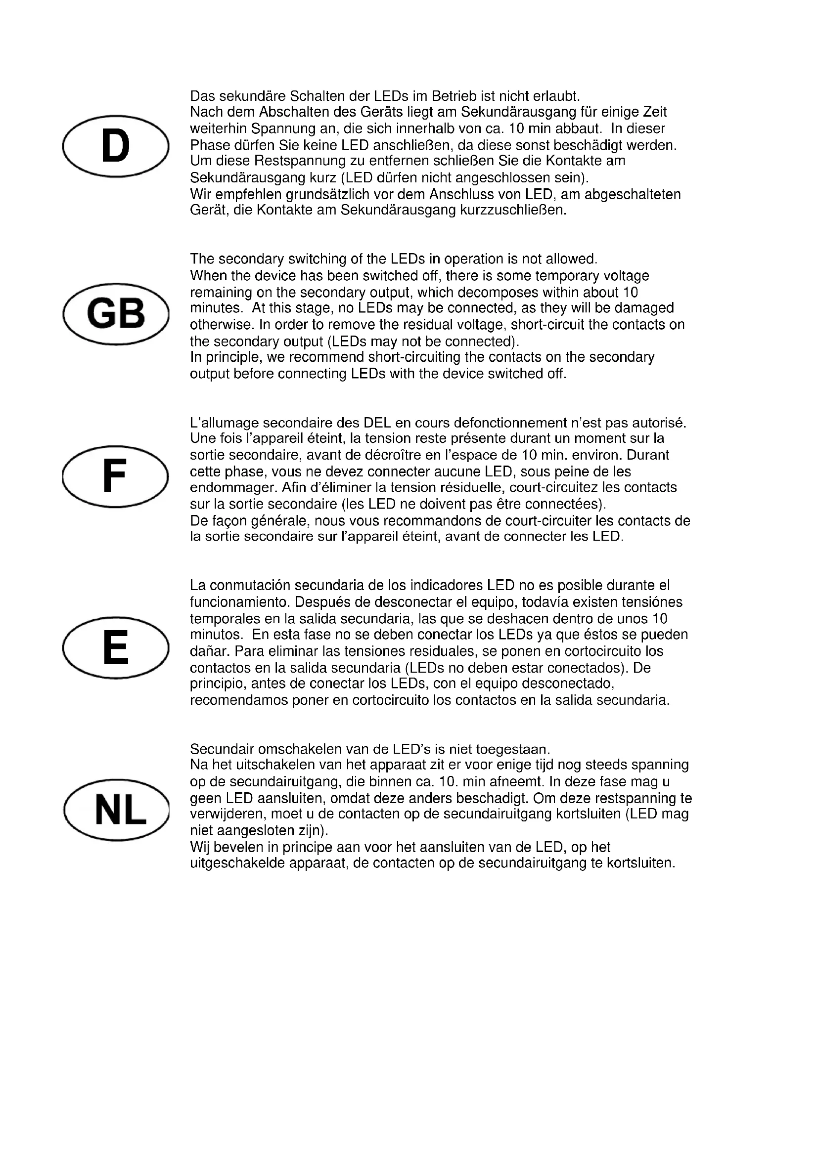 L’allumage secondaire des DEL en cours defonctionnement n’est pas autorisé. Une fois l’appareil éteint, la tension reste présente durant un moment sur la sortie secondaire, avant de décroître en l’espace de 10 min. environ. Durant cette phase, vous ne devez connecter aucune LED, sous peine de les endommager. Afin d’éliminer la tension résiduelle, court-circuitez les contacts sur la sortie secondaire (les LED ne doivent pas être connectées). De façon générale, nous vous recommandons de court-circuiter les contacts de la sortie secondaire sur l’appareil éteint, avant de connecter les LED.