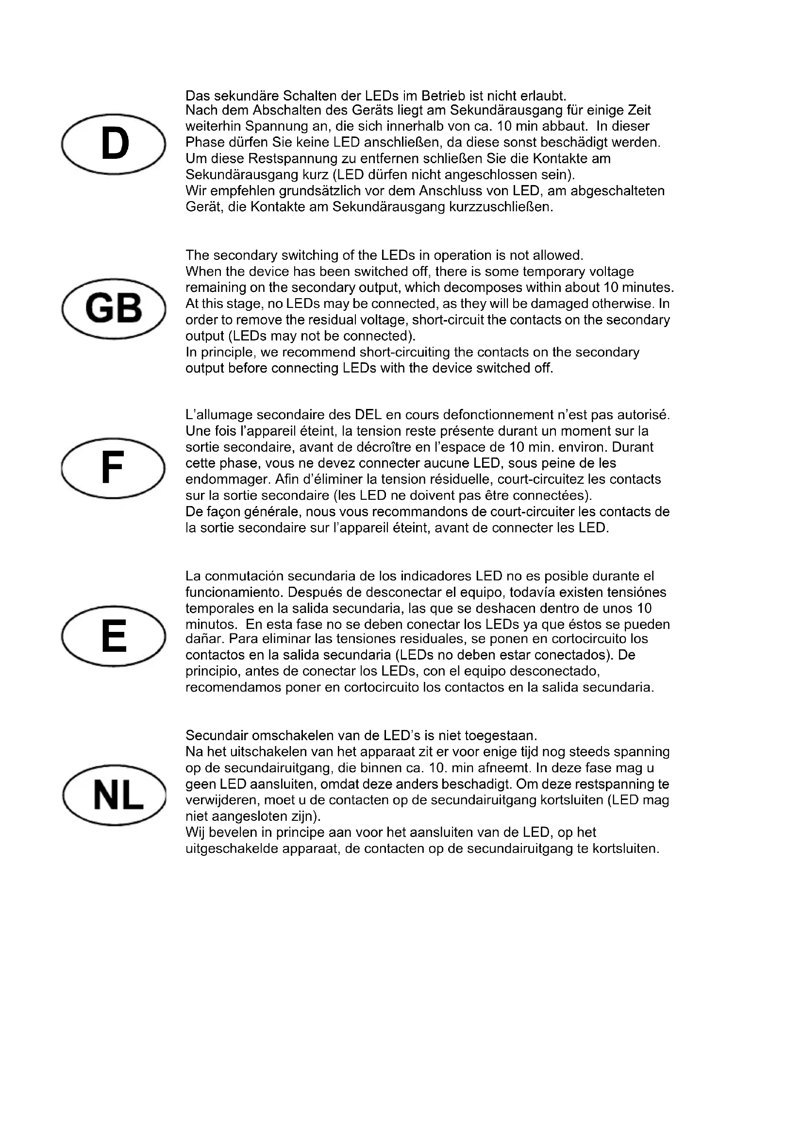 L'allumage secondaire des DEL en cours de fonctionnement n'est pas autorisé. Une fois l'appareil éteint, la tension reste présente durant un moment sur la sortie secondaire, avant de décroître en l'espace de 10 min. environ. Durant cette phase, vous ne devez connecter aucune LED, sous peine de les endommager. Afin d'éliminer la tension résiduelle, court-circuitez les contacts sur la sortie secondaire (les LED ne doivent pas être connectées).