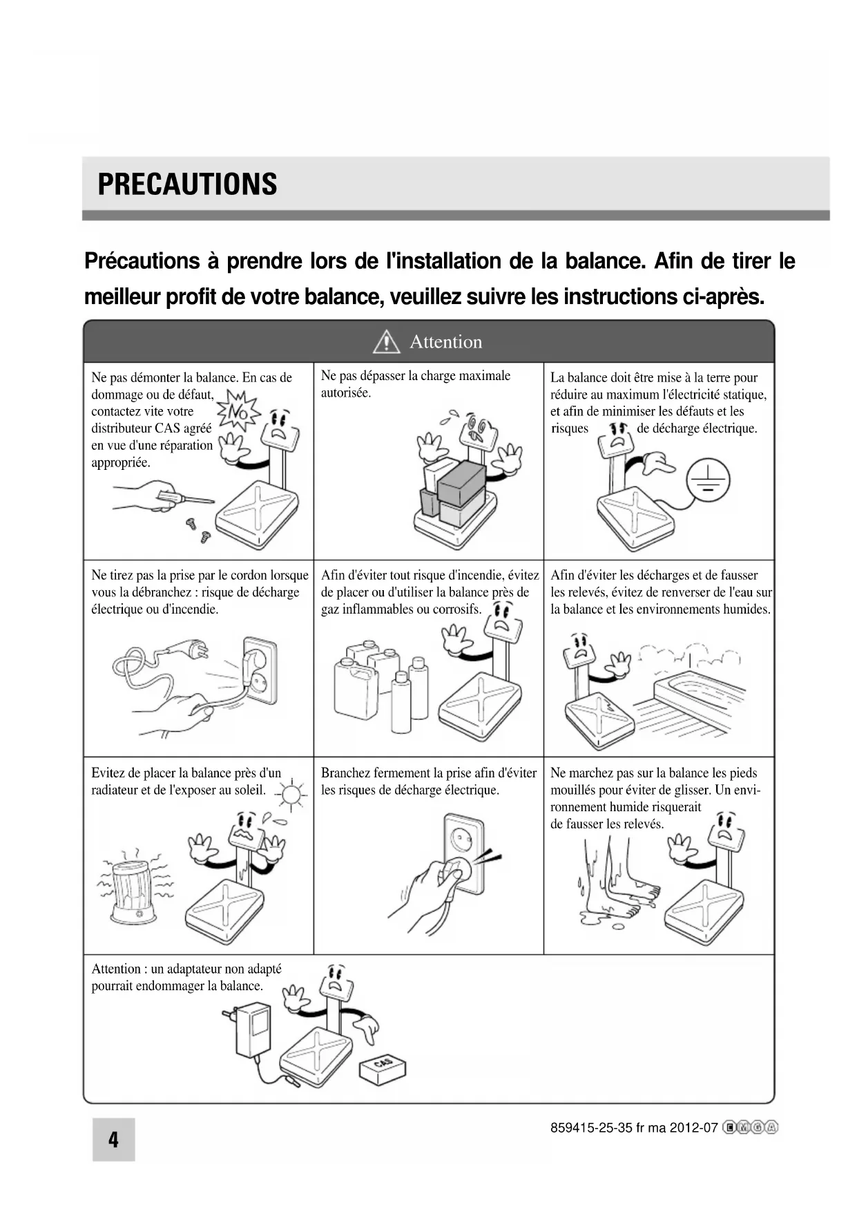 MESSAGES D'ERREUR........................................................22 INTERFACE SERIE................................................................22 CARACTERISTIQUES TECHNIQUES.................................23 859415-25-35 fr ma 2012-074 Ne pas démonter la balance. En cas de dommage ou de défaut, contactez vite votre distributeur CAS agréé risques de décharge électrique. en vue d'une réparation appropriée. Ne pas dépasser la charge maximale autorisée. Ne tirez pas la prise par le cordon lorsque vous la débranchez : risque de décharge électrique ou d'incendie. Afin d'éviter tout risque d'incendie, évitez de placer ou d'utiliser la balance près de gaz inflammables ou corrosifs. Evitez de placer la balance près d'un radiateur et de l'exposer au soleil. La balance doit être mise à la terre pour réduire au maximum l'électricité statique, et afin de minimiser les défauts et les Ne marchez pas sur la balance les pieds mouillés pour éviter de glisser. Un envi- ronnement humide risquerait de fausser les relevés. Attention : un adaptateur non adapté pourrait endommager la balance. Branchez fermement la prise afin d'éviter les risques de décharge électrique. Afin d'éviter les décharges et de fausser les relevés, évitez de renverser de l'eau sur la balance et les environnements humides. Attention PRECAUTIONS Précautions à prendre lors de l'installation de la balance. Afin de tirer le meilleur profit de votre balance, veuillez suivre les instructions ci-après. 859415-25-35 fr ma 2012-075 Pour des relevés fidèles et précis, faites effectuer des contrôles périodiques à votre distributeur CAS autorisé. Evitez tout choc brusque. Cela risquerait d'endommager le mécanisme interne. Retirez la batterie en cas de non-utilisation prolongée. Toute fuite des batteries est potentiellement dangereuse. Placez la balance sur une surface stable où la température est constante. Eloignez la balance d'autres appareils électromagnétiques. Cela risquerait d'altérer la précision des relevés. Tenez la balance par le fond lorsque vous la déplacez. Ne la tenez pas par le plateau. En ajustant les 4 coins de la balance, assurez-vous qu'elle est bien à plat à l'aide du niveau incorporé. Attention Assurez-vous de raccorder votre balance à une prise adaptée. Pour des résultats optimaux, branchez-la 30 minutes avant de l'utiliser. 859415-25-35 fr ma 2012-076 AVANT-PROPOS
