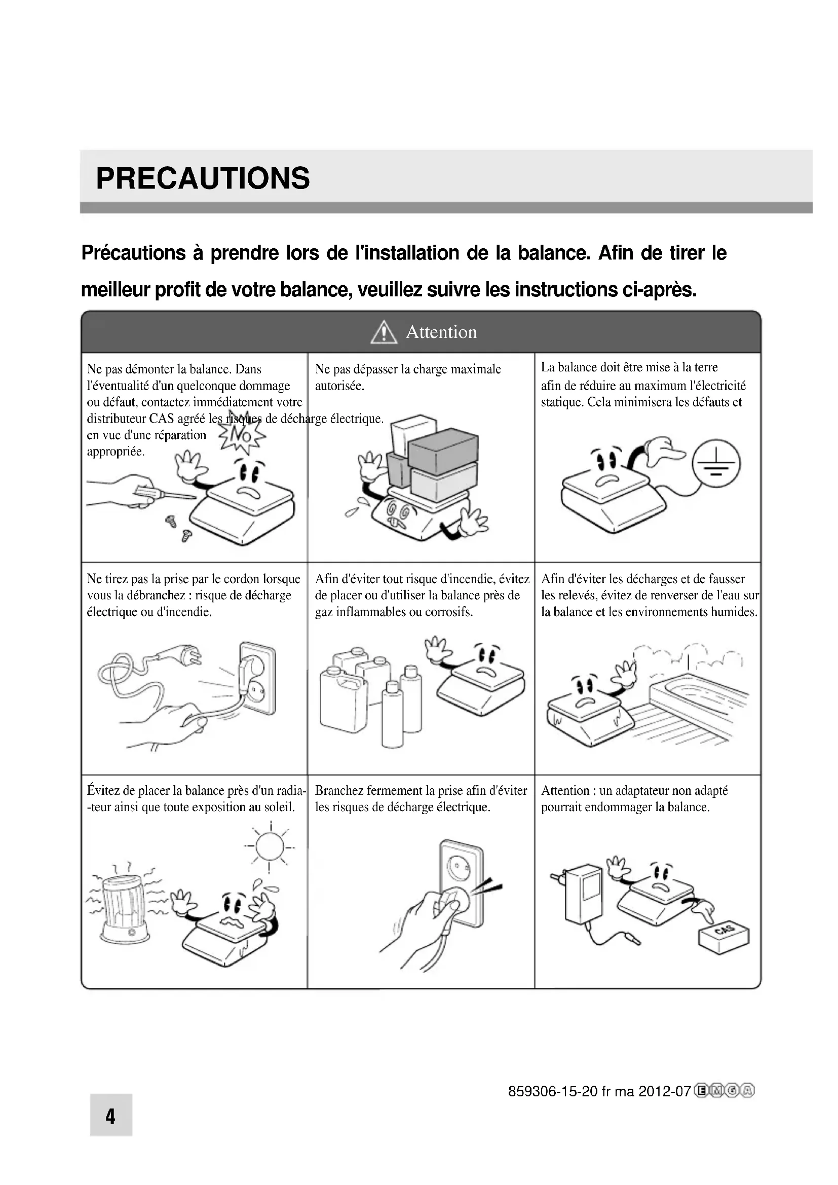 | Ne pas démonter la balance. Dans l'eventualité d'unquelconque dommage ou défaut,contactezimmédiatement vosredistributeur CAS agréés les risques de déché en vue d'une réparation appropriée. | Ne pas dépasser la charge maximale autorisée. | La balance doit être mise à la terre afin de réduire au maximum l'électricité statique.Cela minimisera les défauts et |