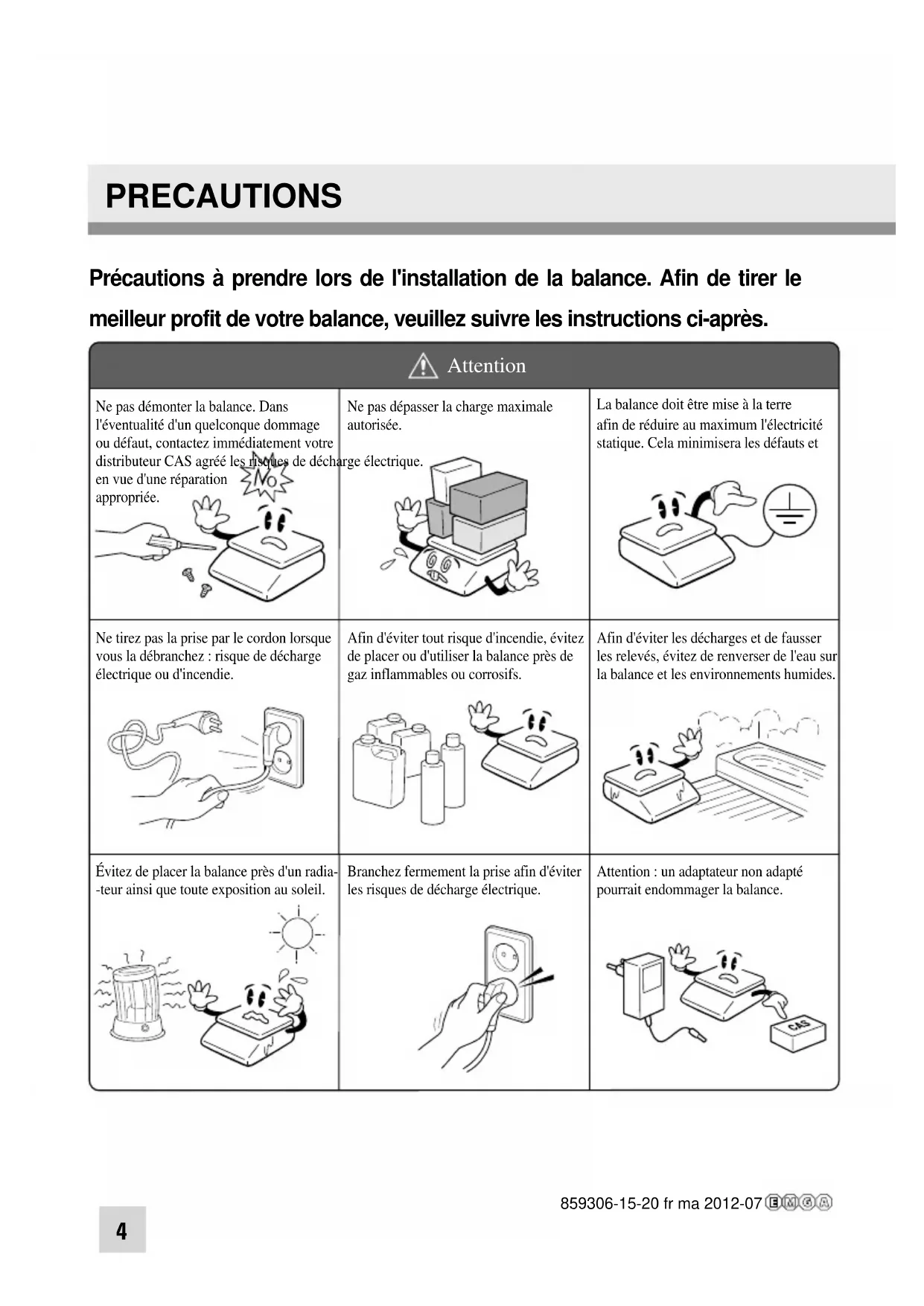 BATTERY MAINTENACE 14 ERROR MESSAGE 14 SPECIFICATIONS 15 859306-15-20 fr ma 2012-074 Ne pas démonter la balance. Dans l'éventualité d'un quelconque dommage ou défaut, contactez immédiatement votre distributeur CAS agréé les risques de décharge électrique. en vue d'une réparation appropriée. Ne pas dépasser la charge maximale autorisée. Ne tirez pas la prise par le cordon lorsque vous la débranchez : risque de décharge électrique ou d'incendie. Afin d'éviter tout risque d'incendie, évitez de placer ou d'utiliser la balance près de gaz inflammables ou corrosifs. Évitez de placer la balance près d'un radia- -teur ainsi que toute exposition au soleil. La balance doit être mise à la terre afin de réduire au maximum l'électricité statique. Cela minimisera les défauts et Attention : un adaptateur non adapté pourrait endommager la balance. Branchez fermement la prise afin d'éviter les risques de décharge électrique. Afin d'éviter les décharges et de fausser les relevés, évitez de renverser de l'eau sur la balance et les environnements humides. Attention PRECAUTIONS Précautions à prendre lors de l'installation de la balance. Afin de tirer le meilleur profit de votre balance, veuillez suivre les instructions ci-après. 859306-15-20 fr ma 2012-075 Pour des relevés fidèles et précis, faites effectuer des contrôles périodiques à votre distributeur CAS agréé. Éviter tout choc brusque. Cela risquerait d'endommager le mécanisme interne. Retirez la batterie en cas de non-utilisation prolongée de la balance. Toute fuite des batteries peut être dangereuse. Placez la balance sur une surface stable où la température est constante. Éloignez la balance d'autres appareils électromagnétiques. Cela risquerait d'altérer la précision des relevés. Tenez la balance par le fond lorsque vous la déplacez. Ne la tenez pas par le plateau. En ajustant les quatre coins de la balance, assurez-vous que la balance est bien à plat à l'aide du niveau incorporé. Attention Assurez-vous de brancher votre balance dans une prise de courant adaptée. Pour des résultats optimaux, branchez-la 30 minutes avant de l'utiliser. 859306-15-20 fr ma 2012-076 AVANT-PROPOS