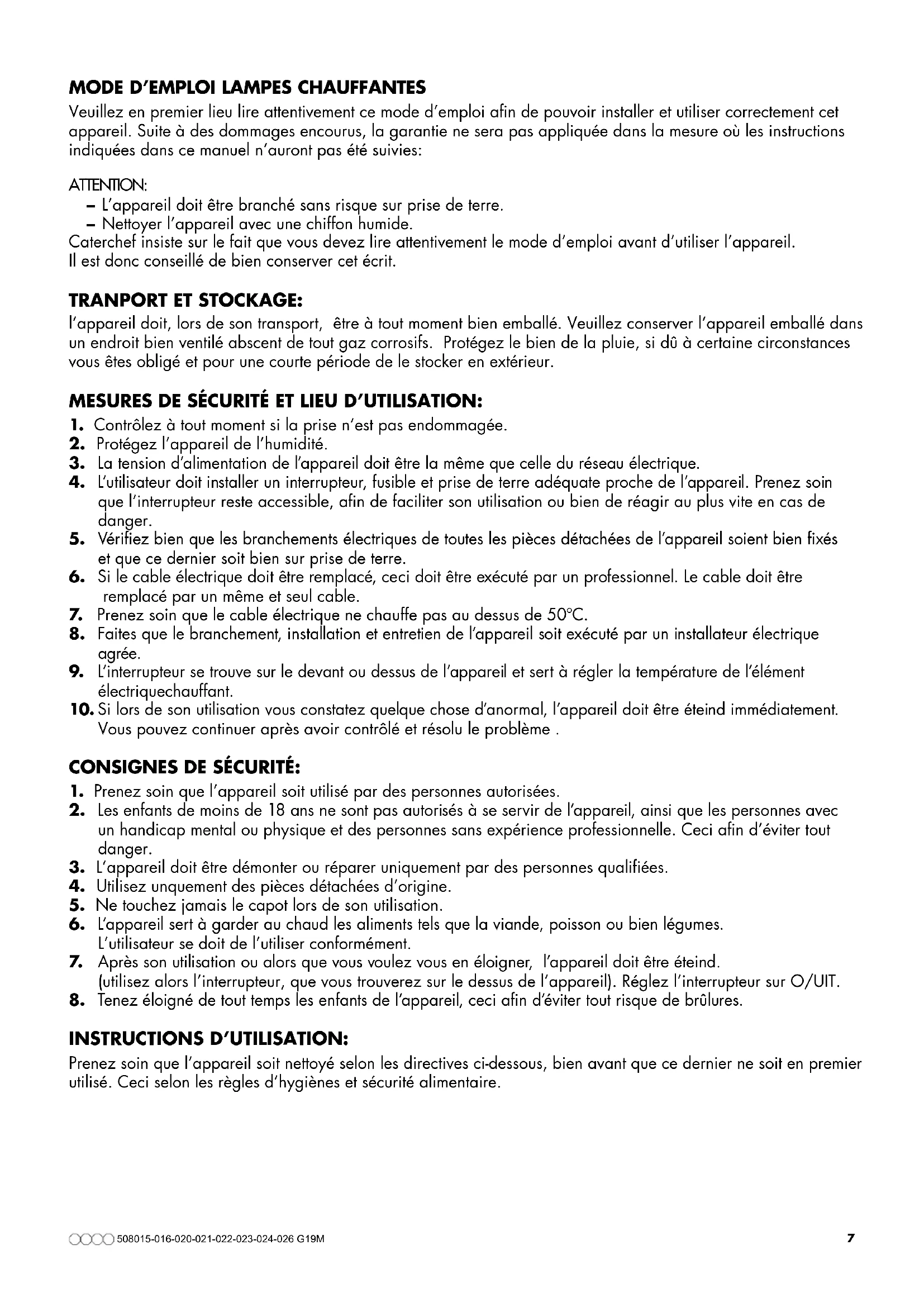 INSTRUCTIONS D’UTILISATION: Prenez soin que l’appareil soit nettoyé selon les directives ci-dessous, bien avant que ce dernier ne soit en premier utilisé. Ceci selon les règles d’hygiènes et sécurité alimentaire. 508015-016-020-021-022-023-024-026 G19M 7NETTOYAGE ET ENTRETIEN: Le capot doit être refroidi avant le nettoyage. Le nettoyage doit être fait par un personnel autorisé et qualifié. Cet appareil peut être nettoyé avec un chiffon humide. ATTENTION! L’appareil ne doit jamais être néttoyé dans ou avec de l’eau. Ceci peut provoquer une court circuit ou autre danger. L’appareil doit être chaque jour/après chaque utilisation nettoyé à fond. AVERTISSEMENT! Ce symbole sur le produit signifie que l’appareil ne doit pas en fin de vie être considéré comme un déchet normal. C’est un déchet spécial et doit être détruit dans une zone de récupération et élimination, comme décrit selon la CE-directive 2002/96/ CE (AEEA). En vous débarrassant comme il se doit de cet appareil vous évitez toute conséquence négative pourl’environnement et la santé publique, dû à la présence de substances dangereuses dans le produit. Nous vous remerçions à l’avance de suivre ces directives. 508015-016-020-021-022-023-024-026 G19M 8Allgemeine Hinweise Wir bitten Sie, diese Bedienungsanleitung sorgfältig zu lesen und gut auf zubewahren, damit Sie bei evtl. Rückfragen jederzeit darin nachschlagen können. Bevor Sie das Gerät anschließen, vergewissern Sie sich, dass die auf dem Typen- schild aufgeführten technischen Angaben (ref.2) mit Spannung und Frequenz Ihres Stromnetzes übereinstimmen. Die Installation darf nur von entsprechend ausgebildeten Fachleuten nach Anweisungen des Herstellers und auf Grundlage der gültigen gesetzlichen Vorschriften durchgeführt werden. Der Hersteller lehnt jede Haftung ab, für: