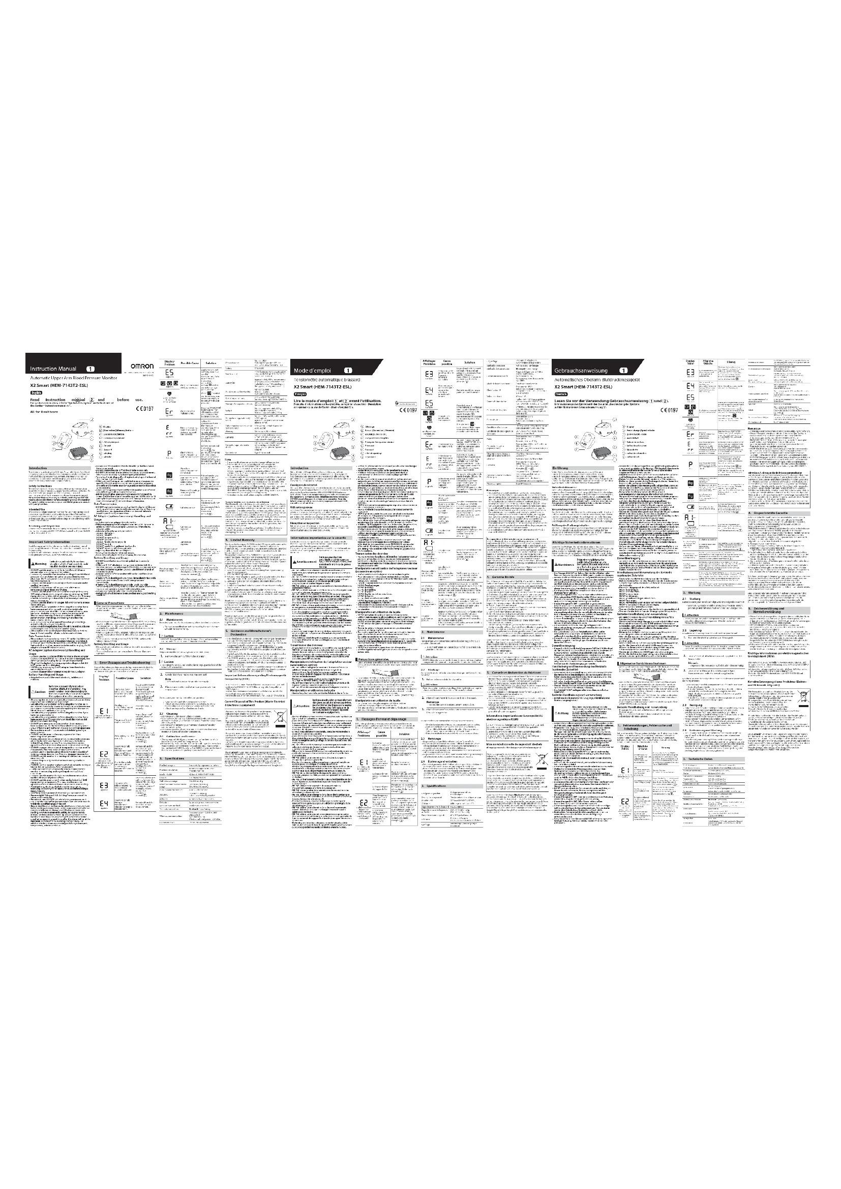 reporter aux informations relatives à la norme CEM pour HEM-7143T2-ESL, disponibles sur le site Web. Ce marquage sur le produit ou sa documentation indique qu’il ne doit pas être éliminé en fin de vie utile avec les autres déchets ménagers. La mise au rebut incontrôlée des déchets pouvant porter préjudice à l’environnement ou à la santé humaine, veuillez séparer ce produit des autres types de déchets et le recycler de façon responsable. Vous favoriserez ainsi la réutilisation durable des ressources matérielles. Les particuliers sont invités à contacter le distributeur leur ayant vendu le produit ou à se renseigner auprès de leur mairie/maison communale pour savoir où et comment ils peuvent rapporter ce produit afin qu’il soit recyclé dans le respect de l’environnement. Les entreprises sont invitées à contacter leur fournisseur et à consulter les condi tions de leur contrat de vent e. Ce produit ne doit pas être mis au rebut avec les autres déchets commerciaux. X2 Smart (HEM-7143T2-ESL) Gebrauchsanweisung Lesen Sie vor der Verwendung Gebrauchsanweisung und . Informationen zu den Symbolen finden Sie unter „Beschreibung der Symbole“ auf der Rückseite von Gebrauchsanweisung . Automatisches Oberarm-Blutdruckmessgerät Deutsch
