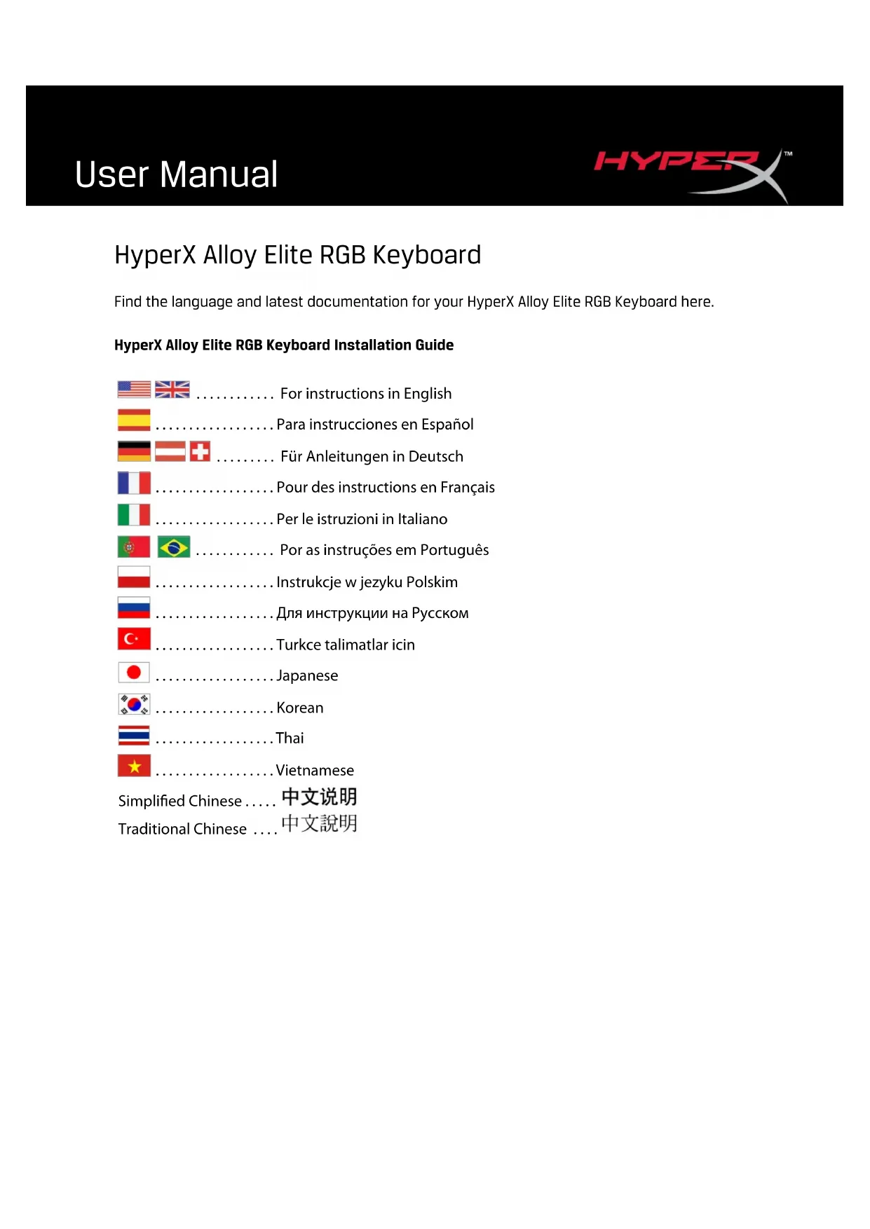 Téléchargez la notice de votre Clavier au format PDF gratuitement ! Retrouvez votre notice Hyperx Alloy Elite - KINGSTON et reprennez votre appareil électronique en main. Sur cette page sont publiés tous les documents nécessaires à l'utilisation de votre appareil Hyperx Alloy Elite de la marque KINGSTON.