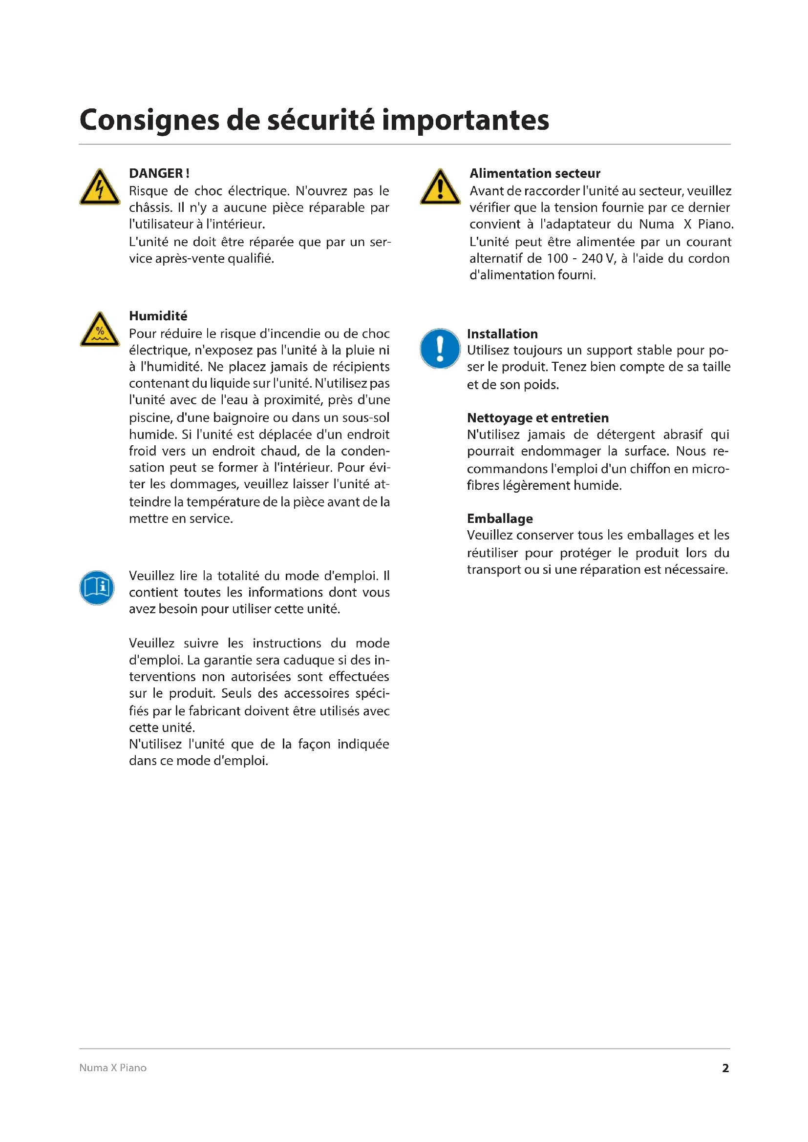 Consignes de sécurité importantes Veuillez lire la totalité du mode d'emploi. Il contient toutes les informations dont vous avez besoin pour utiliser cette unité. Veuillez suivre les instructions du mode d'emploi. La garantie sera caduque si des in- terventions non autorisées sont effectuées sur le produit. Seuls des accessoires spéci- fiés par le fabricant doivent être utilisés avec cette unité. N'utilisez l'unité que de la façon indiquée dans ce mode d'emploi. DANGER! Risque de choc électrique. N'ouvrez pas le châssis. Il n'y a aucune pièce réparable par l'utilisateur à l'intérieur. L'unité ne doit être réparée que par un ser- vice après-vente qualifié. Humidité Pour réduire le risque d'incendie ou de choc électrique, n'exposez pas l'unité à la pluie ni à l'humidité. Ne placez jamais de récipients contenant du liquide sur l'unité. N'utilisez pas l'unité avec de l'eau à proximité, près d'une piscine, d'une baignoire ou dans un sous-sol humide. Si l'unité est déplacée d'un endroit froid vers un endroit chaud, de la conden- sation peut se former à l'intérieur. Pour évi- ter les dommages, veuillez laisser l'unité at- teindre la température de la pièce avant de la mettre en service. Installation Utilisez toujours un support stable pour po- ser le produit. Tenez bien compte de sa taille et de son poids. Nettoyage et entretien N'utilisez jamais de détergent abrasif qui pourrait endommager la surface. Nous re- commandons l'emploi d'un chiffon en micro- fibres légèrement humide. Emballage Veuillez conserver tous les emballages et les réutiliser pour protéger le produit lors du transport ou si une réparation est nécessaire. Alimentation secteur Avant de raccorder l'unité au secteur, veuillez vérifier que la tension fournie par ce dernier convient à l'adaptateur du Numa X Piano. L'unité peut être alimentée par un courant alternatif de 100 - 240V, à l'aide du cordon d'alimentation fourni.Numa X Piano