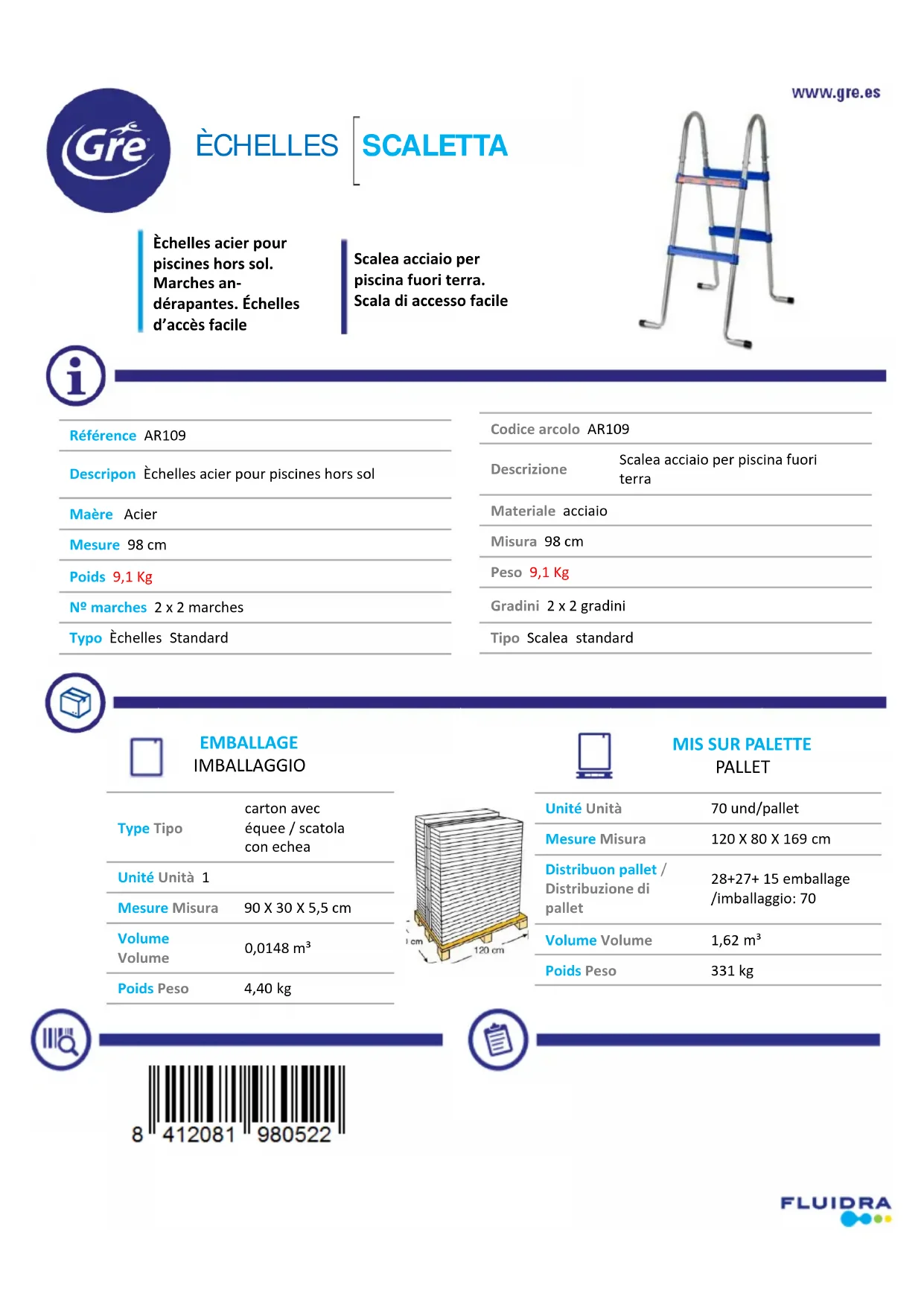 L'échelle GRE AR109 mesure 1,8 m de hauteur et 0,5 m de largeur lorsqu'elle est complètement dépliée.