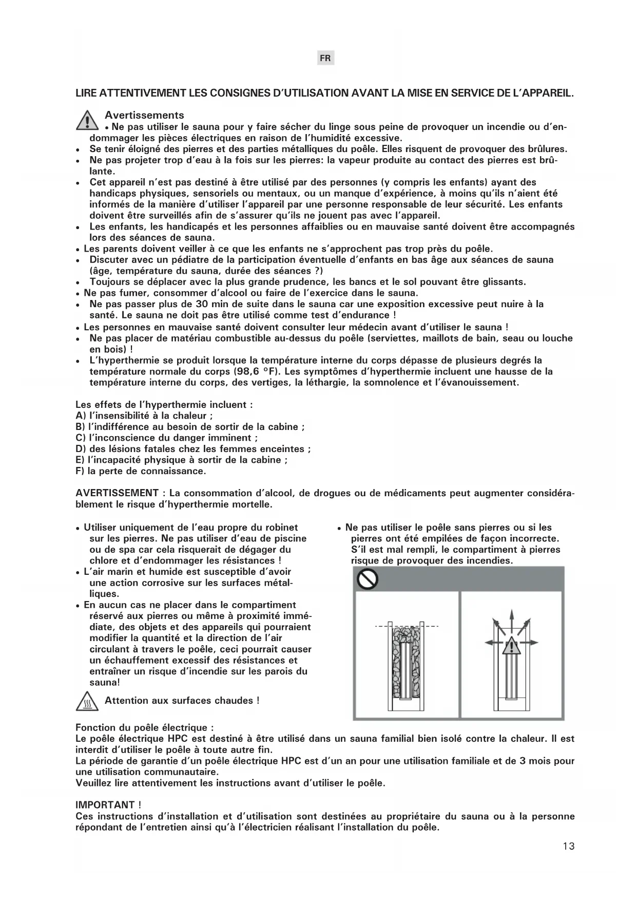 Se tenir éloigné des pierres et des parties métalliques du poêle. Elles risquent de provoquer des brûlures. - Ne pas projeter trop d'eau à la fois sur les pierres : la vapeur produite au contact des pierres est brûlante. - Cet appareil n'est pas destiné à être utilisé par des personnes (y compris les enfants) ayant des handicaps physiques, sensoriels ou mentaux, ou un manque d'expérience, à moins qu'ils n'aient été informés de la manière d'utiliser l'appareil par une personne responsable de leur sécurité. Les enfants doivent être surveillés afin de s'assurer qu'ils ne jouent pas avec l'appareil. - Les enfants, les handicapés et les personnes affaiblies ou en mauvaise santé doivent être accompagnés lors des séances de sauna. - Les parents doivent veiller à ce que les enfants ne s'approchent pas trop près du poêle. - Discuter avec un pédiatre de la participation éventuelle d'enfants en bas âge aux séances de sauna (âge, température du sauna, durée des séances ?) - Toujours se déplacer avec la plus grande prudence, les bancs et le sol pouvant être glissants. - Ne pas fumer, consommer d'alcool ou faire de l'exercice dans le sauna. - Ne pas passer plus de 30 min de suite dans le sauna car une exposition excessive peut nuire à la santé. Le sauna ne doit pas être utilisé comme test d'endurance! - Les personnes en mauvaise santé doivent consulter leur médecin avant d'utiliser le sauna! - Ne pas placer de matériel combustible au-dessus du poêle (serviettes, maillots de bain, seau ou louche en bois) ! L'hyperthermie se produit lorsque la température interne du corps dépasse de plusieurs degrés la température normale du corps (98,6 °F). Les symptômes d'hyperthermie incluent une hausse de la température interne du corps, des vertiges, la léthargie, la somnolence et l'évanouissement.