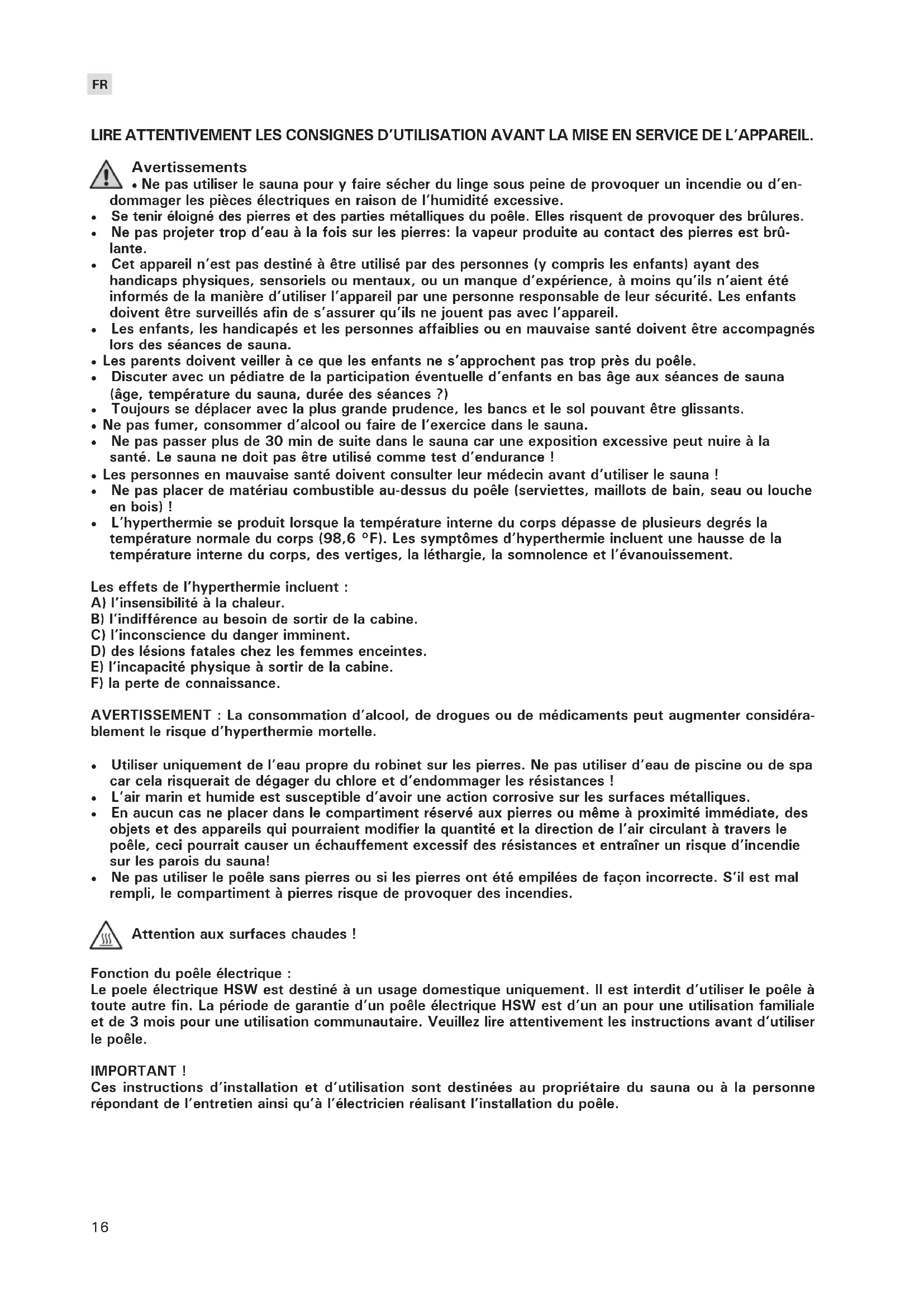 - Ne pas utiliser le poêle sans pierres ou si les pierres ont été empilées de façon incorrecte. S’il est mal rempli, le compartiment à pierres risque de provoquer des incendies. Fonction du poêle électrique : Le poele électrique HSW est destiné à un usage domestique uniquement. Il est interdit d’utiliser le poêle à toute autre fin. La période de garantie d’un poêle électrique HSW est d’un an pour une utilisation familiale et de 3 mois pour une utilisation communautaire. Veuillez lire attentivement les instructions avant d’utiliser le poêle. IMPORTANT ! Ces instructions d’installation et d’utilisation sont destinées au propriétaire du sauna ou à la personne répondant de l’entretien ainsi qu’à l’électricien réalisant l’installation du poêle. Attention aux surfaces chaudes !17
