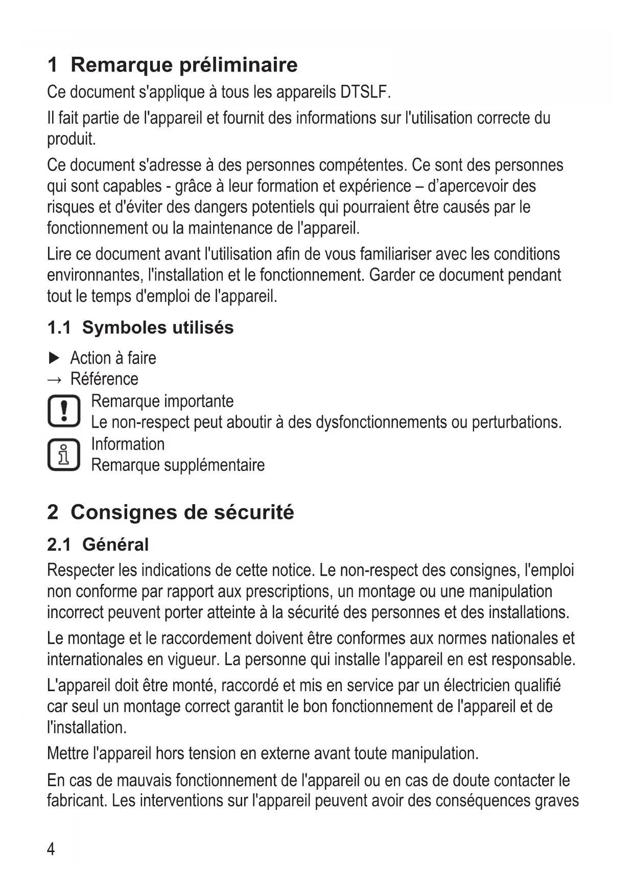 Respecter les indications de cette notice Le non-respect des consignes, l'emploi non conforme par rapport aux prescriptions, un montage ou une manipulation incorrect peuvent porter atteinte à la sécurité des personnes et des installations Le montage et le raccordement doivent être conformes aux normes nationales et internationales en vigueur La personne qui installe l'appareil en est responsable L'appareil doit être monté, raccordé et mis en service par un électricien qualifié car seul un montage correct garantit le bon fonctionnement de l'appareil et de l'installation Mettre l'appareil hors tension en externe avant toute manipulation En cas de mauvais fonctionnement de l'appareil ou en cas de doute contacter le fabricant Les interventions sur l'appareil peuvent avoir des conséquences graves5
