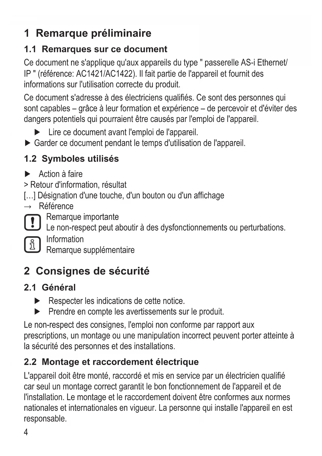 Ce document ne s'applique qu'aux appareils du type " passerelle AS-i Ethernet/ IP " (référence: AC1421/AC1422) Il fait partie de l'appareil et fournit des informations sur l'utilisation correcte du produit Ce document s'adresse à des électriciens qualifiés Ce sont des personnes qui sont capables – grâce à leur formation et expérience – de percevoir et d'éviter des dangers potentiels qui pourraient être causés par l'emploi de l'appareil ► Lire ce document avant l'emploi de l'appareil ► Garder ce document pendant le temps d'utilisation de l'appareil