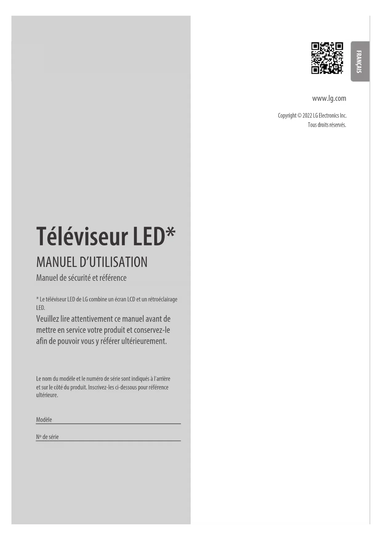 FRANÇAIS www.lg.com Copyright © 2022 LG Electronics Inc. Tous droits réservés. Veuillez lire attentivement ce manuel avant de mettre en service votre produit et conservez-le afin de pouvoir vous y référer ultérieurement. Le nom du modèle et le numéro de série sont indiqués à l'arrière et sur le côté du produit. Inscrivez-les ci-dessous pour référence ultérieure. Modèle Nº de série Téléviseur LED* Manuel de sécurité et référence