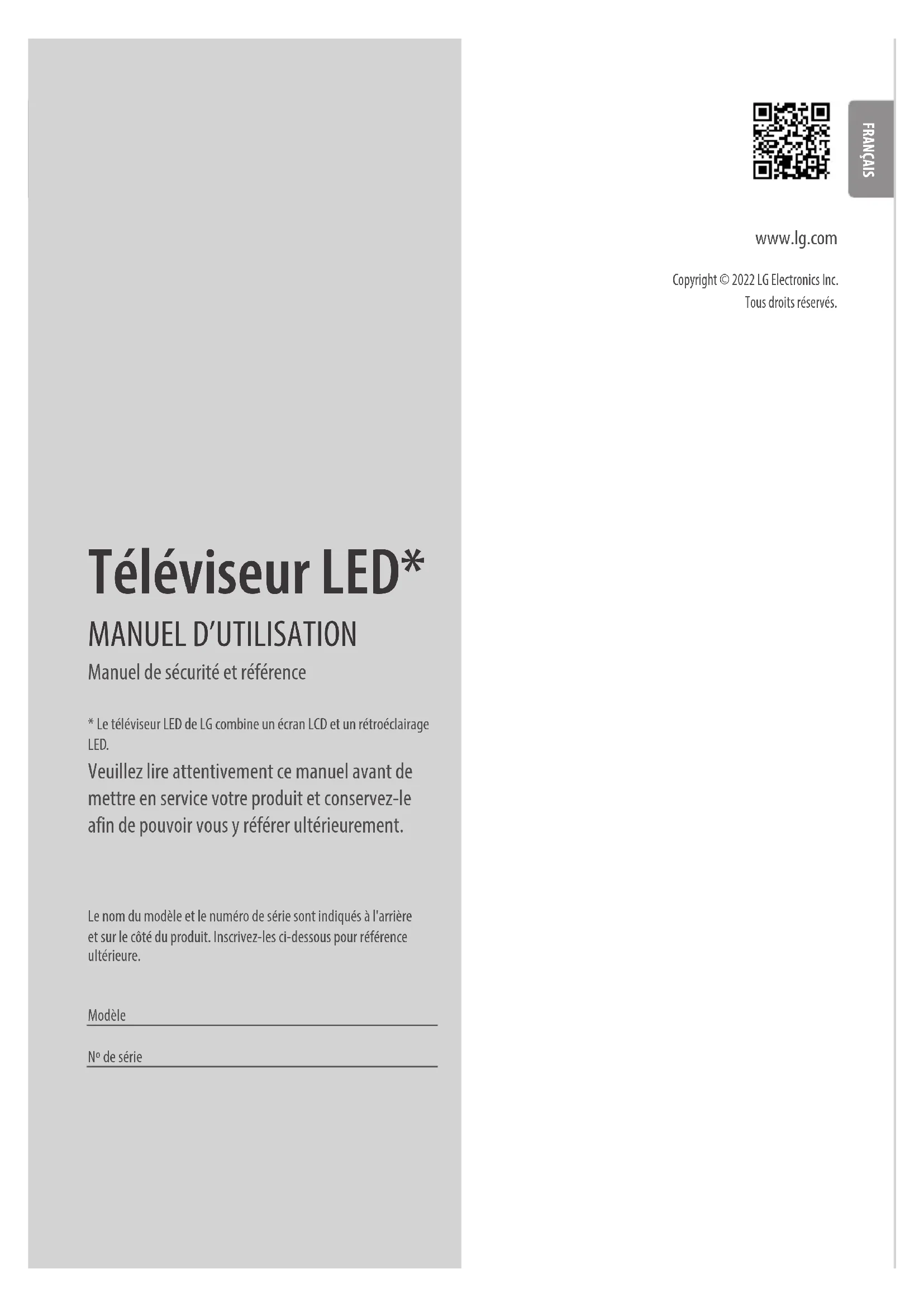 FRANÇAIS www.lg.com Copyright © 2022 LG Electronics Inc. Tous droits réservés. Veuillez lire attentivement ce manuel avant de mettre en service votre produit et conservez-le afin de pouvoir vous y référer ultérieurement. Le nom du modèle et le numéro de série sont indiqués à l'arrière et sur le côté du produit. Inscrivez-les ci-dessous pour référence ultérieure. Modèle Nº de série Téléviseur LED* Manuel de sécurité et référence