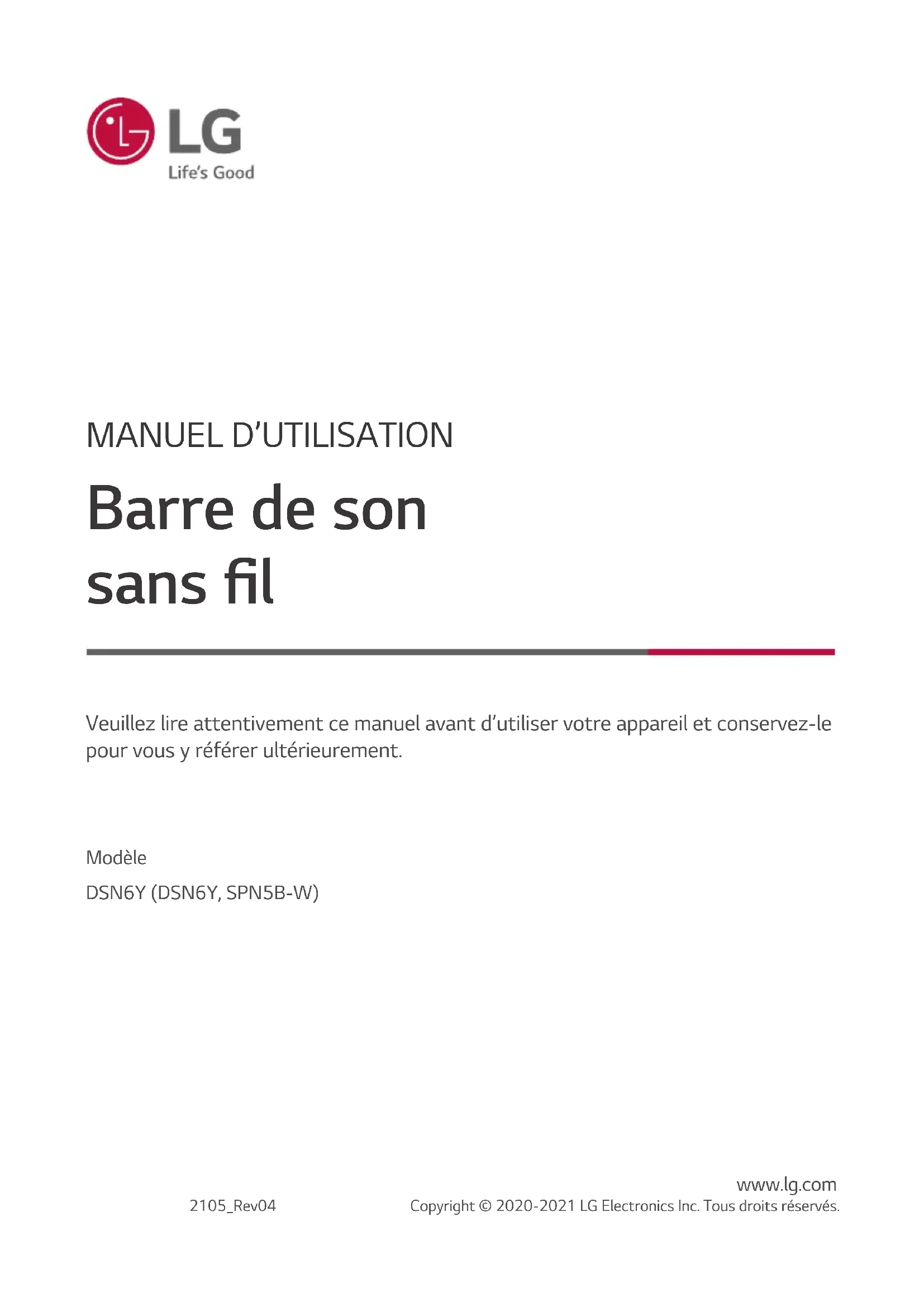 Barre de son sans l Veuillez lire attentivement ce manuel avant d’utiliser votre appareil et conservez-le pour vous y référer ultérieurement. Modèle DSN6Y (DSN6Y, SPN5B-W) 2105_Rev04 www.lg.com Copyright © 2020-2021 LG Electronics Inc. Tous droits réservés.1 Démarrage Démarrage2 Démarrage