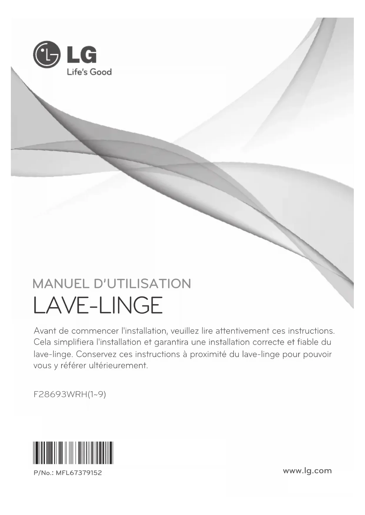 LAVE-LINGE F28693WRH(1~9) P/No.: MFL67379152 www.lg.com Avant de commencer l'installation, veuillez lire attentivement ces instructions. Cela simplifiera l'installation et garantira une installation correcte et fiable du lave-linge. Conservez ces instructions à proximité du lave-linge pour pouvoir vous y référer ultérieurement.Sommaire