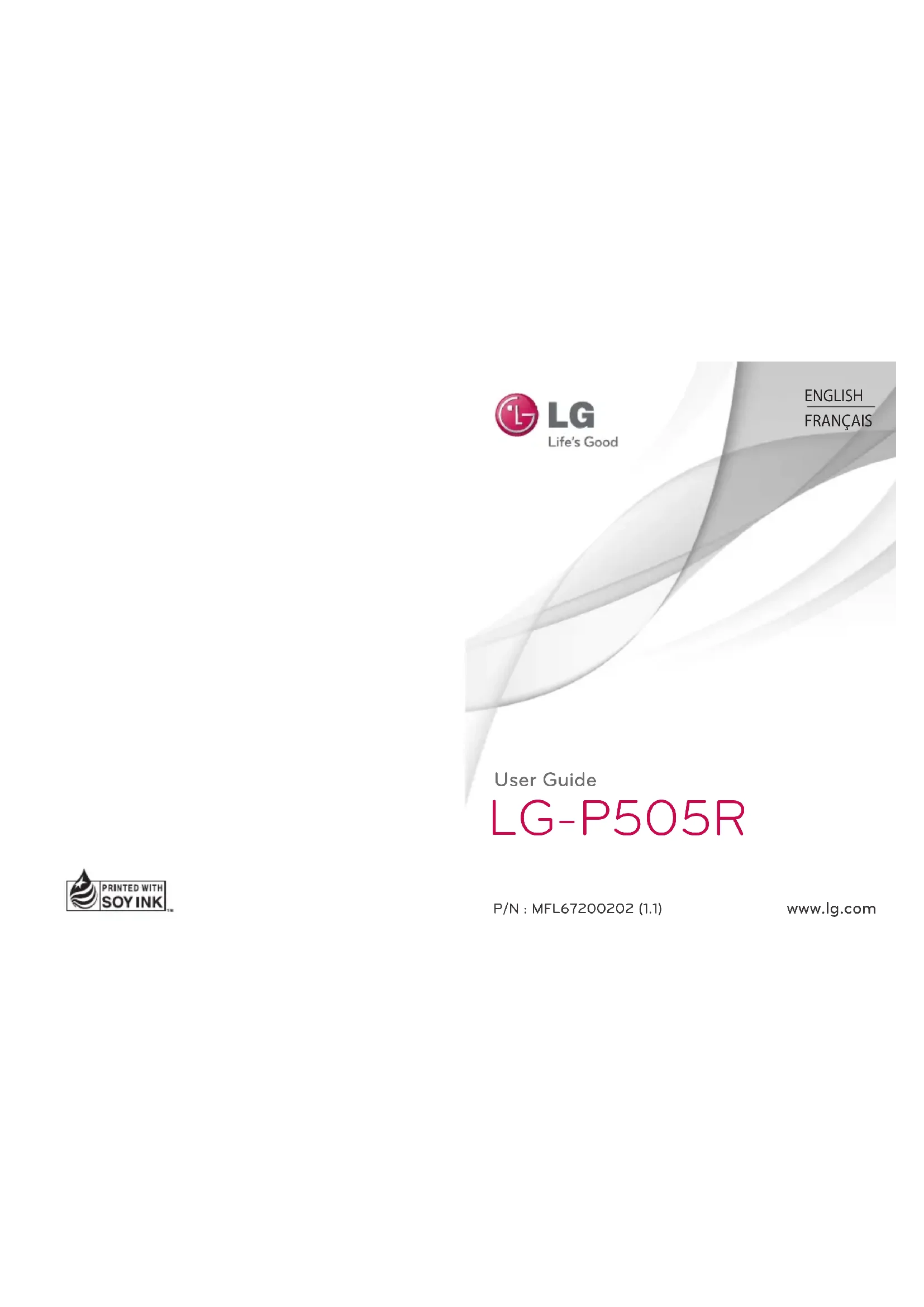 - Google™, Google Maps™, Google mail™, YouTube™, Google Talk™ et Android Market™ sont des marques de commerce de Google, Inc. LG-P505R Guide de l’utilisateur Félicitations ! Vous venez de faire l’acquisition du LG-P505R, un téléphone cellulaire sophistiqué et compact conçu par LG pour tirer profit des toutes dernières technologies de communication mobile numérique. Les informations contenues dans ce guide peuvent différer de votre téléphone selon le logiciel et le fournisseur de service.2 Table des Matières Avertissement p. 5