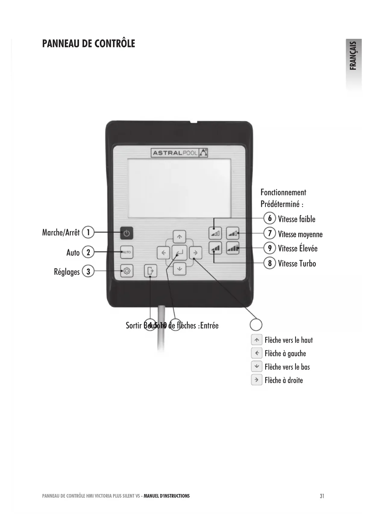 Réglages Sortir Boutons de flèches :Entrée Fonctionnement Prédéterminé : Vitesse faible Vitesse moyenne Vitesse Élevée Vitesse Turbo Flèche vers le haut Flèche vers le bas Flèche à gauche Flèche à droitePANNEAU DE CONTRÔLE HMI VICTORIA PLUS SILENT VS - MANUEL D'INSTRUCTIONS