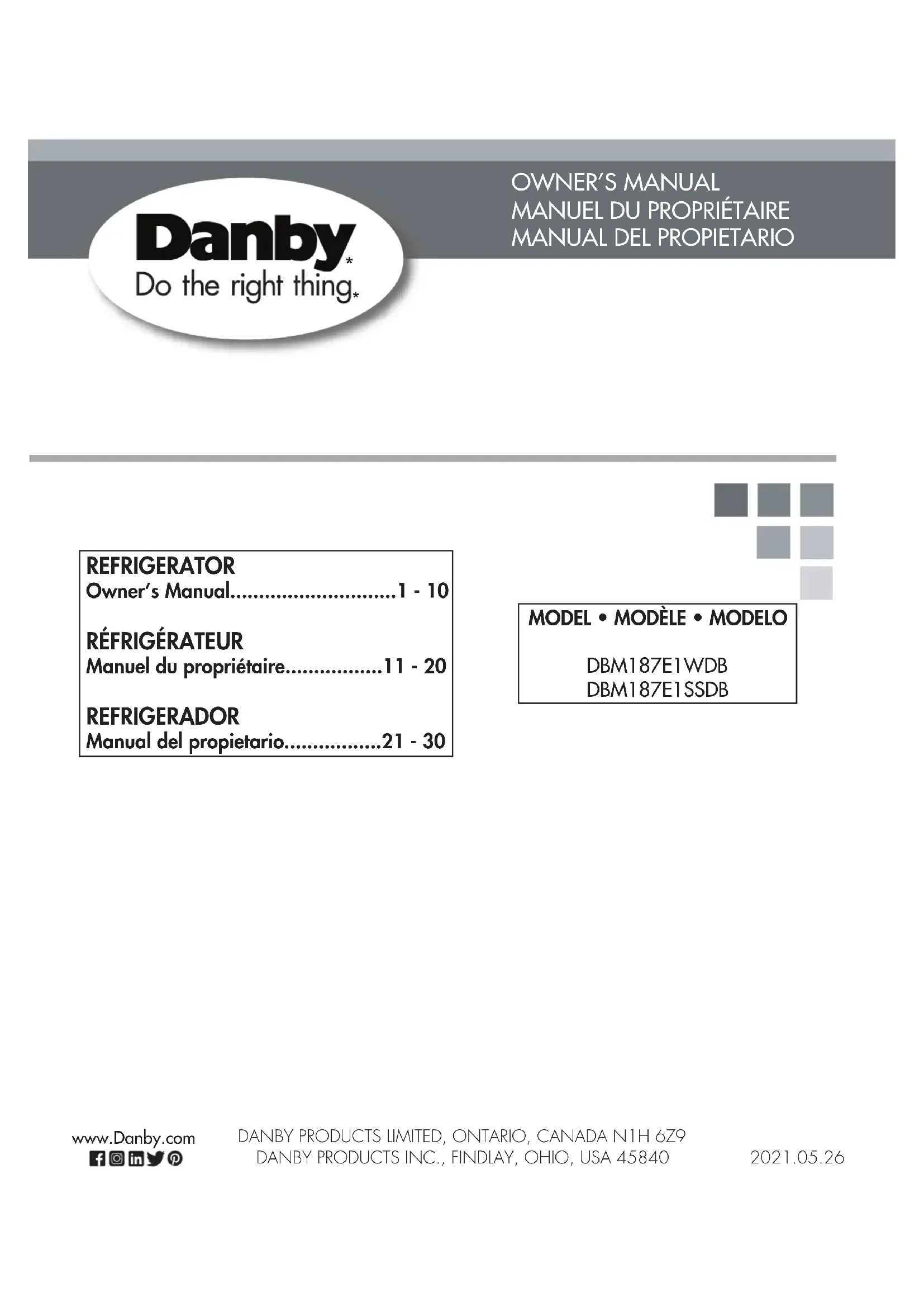 Cet appareil de qualité est garanti exempt de tout vice de matière première et de fabrication, s’il est utilisé dans les conditions normales recommandées par le fabricant. Cette garantie n’est offerte qu’à l’acheteur initial de l’appareil vendu par Danby Products Limited (Canada) ou Danby Products Inc. (É.-U.) (ci-après « Danby ») ou par l’un de ses distributeurs agréés et elle ne peut être transférée.CONDITIONS Les pièces en plastique sont garanties pendant trente (30) jours seulement à partir de la date de l’achat, sans aucune prolongation prévue. Aucune partie de la garantie ne prévoit implicitement que le fabricant sera tenu responsable des dommages subis par les aliments ou d’autres types de contenu, qu’ils soient causés par la défectuosité de l’appareil ou par son usage adéquat ou inadéquat.EXCLUSIONS En vertu de la présente, il n’existe aucune autre garantie, condition ou représentation, qu’elle soit exprimée ou tacite, de façon manifeste ou intentionnelle, par Danby ou ses distributeurs agréés. De même, sont exclues toutes les autres garanties, conditions ou représentations, y compris les garanties, conditions ou représentations en vertu de toute loi régissant la vente de produits ou de toute autre législation ou règlement semblable. En vertu de la présente, Danby ne peut être tenue responsable en cas de blessures corporelles ou de dégâts matériels, y compris à l’appareil, quelle qu’en soit les causes. Danby ne peut pas être tenue responsable des dommages indirects dus au fonctionnement défectueux de l’appareil. En achetant l’appareil, l’acheteur accepte de tenir sans reproche et de dégager Danby de toute responsabilité en cas de réclamation pour toute blessure corporelle ou tout dégât matériel causé par cet appareil.CONDITIONS GÉNÉRALESLa garantie ou assurance ci-dessus ne s’applique pas si les dégâts ou réparations sont dus aux cas suivants : 1) Panne de courant.2) Dommages subis pendant le transport ou le déplacement de l’appareil.3) Alimentation électrique incorrecte (tension faible, câblage défectueux, fusibles incorrects). 4) Accident, modification, emploi abusif ou incorrect de l’appareil tel qu'une circulation d'air inadéquate dans la pièce ou des conditions de fonctionnement anormales (température extrêmement élevée ou basse). 5) Utilisation dans un but commercial ou industriel (à savoir, si l'appareil n'est pas installé dans un domicile résidentiel). 6) Incendie, dommages causés par l’eau, le vol, la guerre, une émeute, des hostilités, ou en cas de force majeure (ouragan, inondation, etc.).7) Visites d’un technicien pour expliquer le fonctionnement de l’appareil au propriétaire. 8) Installation inappropriée (par exemple, encastrement d'un appareil autoportant, ou utilisation extérieure d'un appareil non conçu à cet effet, y compris, mais sans s'y limiter : les garages, les patios, les porches ou ailleurs, qui ne sont pas correctement isolés ou climatisés). La preuve de la date d'achat sera requise pour les réclamations de garantie; conserver la facture de vente. Dans le cas où un service de garantie est requis, présentez la preuve d'achat à notre dépôt de service agréé. Service sous garantie Service au domicile Danby Products Limited PO Box 1778, Guelph, Ontario, Canada N1H 6Z9 Téléphone : (519) 837-0920 Télécopieur : (519) 837-0449 Danby Products Inc. PO Box 669, Findlay, Ohio, U.S.A. 45840 Téléphone : (419) 425-8627 Télécopieur : (419) 425-8629 1-800-263-2629 02/18 Premiers 12 mois21 Bienvenido a la familia Danby. Estamos orgullosos de nuestros productos de calidad y creemos en un servicio confi able. Le sugerimos que lea este manual del propietario antes de enchufar su nuevo electrodoméstico, ya que contiene información importante de funcionamiento, información de seguridad, solución de problemas y consejos de mantenimiento para garantizar la confi abilidad y longevidad de su electrodoméstico. Tiene derecho a la cobertura de la garantía como se describe en el manual del propietario que se proporciona con su nuevo electrodoméstico.