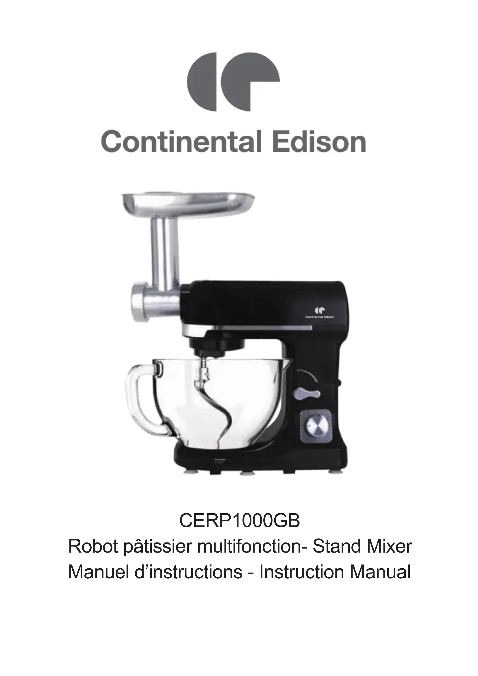 CERP1000GB Robot pâtissier multifonction- Stand Mixer Manuel d’instructions - Instruction ManualINSTRUCTIONS GÉNÉRALES DE SÉCURITÉ Lisez attentivement les instructions d'utilisation avant de mettre l'appareil en service et conservez-les pour toute référence ultérieure. Conseils de sécurité importants ● Cet appareil peut être utilisé par des personnes dont les capacités physiques, sensorielles ou mentales sont réduites ou dont l'expérience ou les connaissances ne sont pas suffisantes, à condition qu'ils bénéficient d'une surveillance ou qu'ils aient reçu des instructions quant à l'utilisation de l'appareil en toute sécurité et dans la mesure où ils en comprennent bien les dangers potentiels. ● Cet appareil peut être utilisé par des enfants âgés d'au moins 8 ans, à condition qu'ils bénéficient d'une surveillance ou qu'ils aient reçu des instructions quant à l'utilisation de l'appareil en toute sécurité et qu'ils comprennent bien les dangers encourus. Le nettoyage et l'entretien de l'utilisateur ne doivent pas être effectués par des enfants, à moins qu'ils ne soient âgés d'au moins 8 ans et qu'ils soient sous la surveillance d'un adulte. Conserver l'appareil et son câble hors de portée des enfants âgés de moins de 8 ans. ● Pour éviter les décharges électriques, n’utilisez pas cet appareil à proximité de l’eau. Ne plongez pas le cordon d’alimentation dans l’eau ou tout autre liquide. ● Ne laissez pas le cordon d'alimentation pendre du bord d'une table ou d'un comptoir. ● Assurez-vous que la tension indiquée sur la plaque signalétique correspond à celle de la source d’alimentation. La plaque signalétique se trouve sur la partie inférieure du bloc moteur. Le robot doit uniquement être raccordé à une source 1d’alimentation de courant alternatif. Le moteur doit toujours être éteint avant de brancher le robot à la source d’alimentation. (Bouton de commande [7] sur la position « 0 ».) ● Ne l’utilisez pas à l’extérieur. Convient uniquement pour une utilisation à l’intérieur. ● Cet appareil ne doit pas être installé à proximité d’une flamme, de matériaux facilement inflammables (rideaux, textiles, etc.), d’un radiateur, d’un four ou de toute autre source de chaleur. ● Avant toute utilisation, placez l’appareil sur une surface horizontale et plane. ● Placez cet appareil le plus près possible de la source d’alimentation afin de pouvoir débrancher la prise rapidement et facilement. ● L’appareil doit être utilisé avec le type d’alimentation spécifié sur la plaque signalétique. Si vous n’êtes pas sûr des détails de l’alimentation électrique disponible, demandez à votre revendeur ou à la compagnie d’électricité locale. ● N’essayez pas de réparer l’appareil vous-même, car vous risquez d’être exposé à des composants dangereux sous tension ou à d’autres dangers en ouvrant et en retirant les couvercles. ● Les réparations doivent être effectuées uniquement dans un atelier qualifié. ● Utilisez l’appareil conformément à ces instructions ; toute mauvaise utilisation peut provoquer un choc électrique et/ou d’autres risques de blessures. ● Faites preuve de prudence avec les lames à bord tranchant lorsque vous manipulez ou nettoyez les pièces du hachoir. ● L’appareil doit être utilisé et stocké hors de portée des enfants. ● L’appareil doit être utilisé uniquement pour l’utilisation auquel il est destiné.