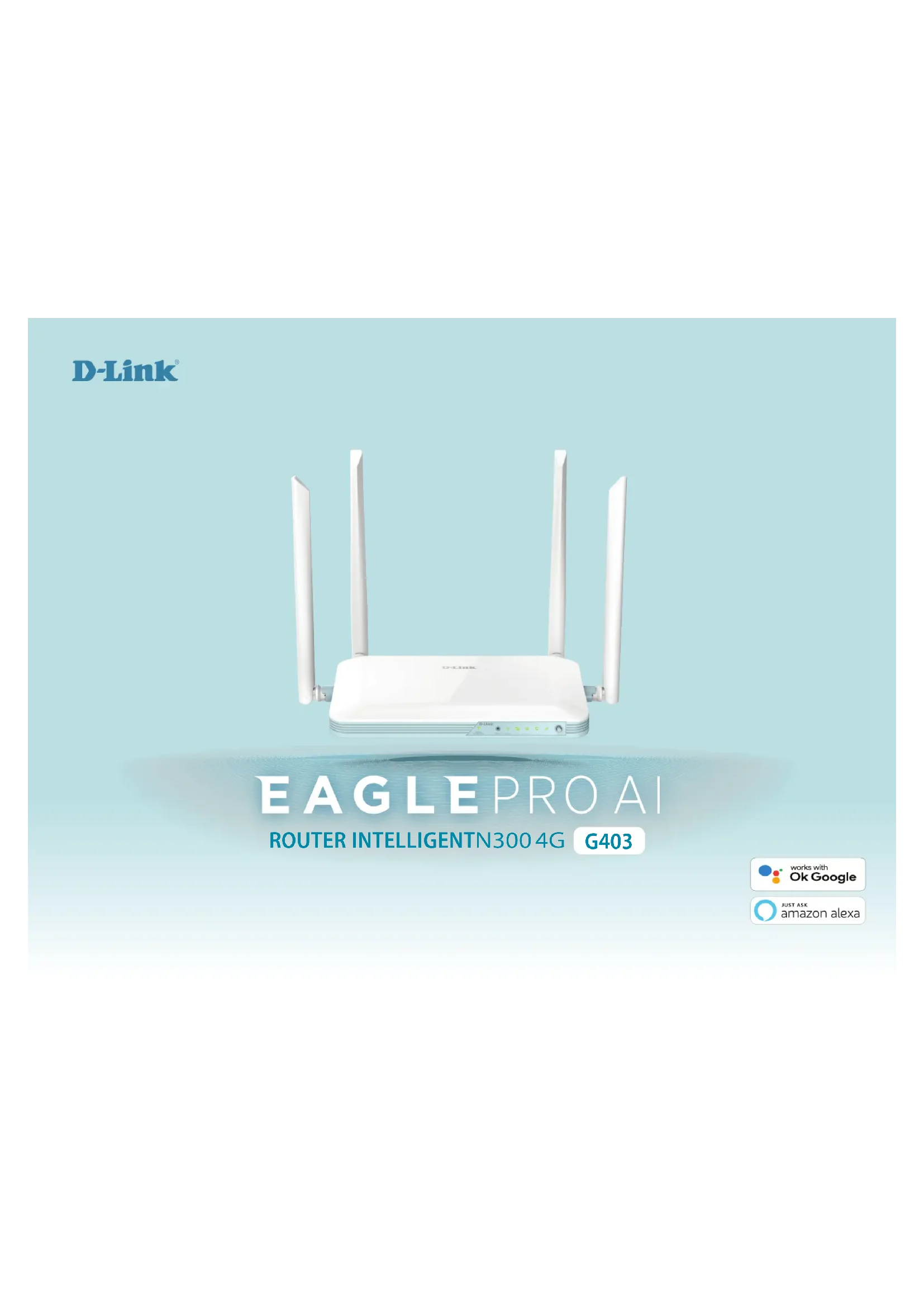 Introduction Grâce à la connectivité mobile large bande 4G LTE/3G et aux fonctions intelligentes intégrées à l'IA, le G403 est un compagnon idéal pour les applications résidentielles et les petites et moyennes entreprises. Le G403 supporte le WLAN 802.11n avec une vitesse allant jusqu'à 300 Mbits/s, et 4 ports Ethernet 10/100 Mbits/s intégrés pour la connectivité laire. En outre, la toute nouvelle application IA d'Eagle Pro ore un grand nombre de fonctions assistées par IA pour vous aider à optimiser votre environnement Wi-Fi. Le G403 supporte également l'assistance vocale avec Amazon Alexa et Google Assistant, ce qui vous permet de contrôler votre réseau à l'aide de commandes vocales. Caractéristiques Connectivité sans l uide avec rétrocompatibilité L'innovant Optimiseur de trac IA fournit un rapport d'utilisation hebdomadaire pour informer les administrateurs de la consommation de la bande passante du réseau par les gros utilisateurs. Il évalue également l'état général du réseau sans l et indique le nombre de fois où le moteur a optimisé le réseau automatiquement en fonction des conditions du réseau et des données d'utilisation. Fonctionnalités intelligente de qualité de service améliorées La qualité de service (QoS) vous permet de donner la priorité au trac important an de garantir que les applications en temps réel reçoivent une bande passante optimale. En outre, le moteur à intelligence articielle intégré recueille et analyse les données relatives au trac et informe les administrateurs des clients qui consomment beaucoup de bande passante an qu'ils puissent prendre des mesures rapides. Toujours à jour avec les dernières fonctionnalités Le G403 vérie automatiquement chaque jour les mises à jour pour s'assurer que l'appareil dispose toujours des dernières fonctionnalités et du rmware le plus sécurisé, et installe la mise à jour en silence en arrière-plan. Pour une tranquillité d'esprit supplémentaire, en cas d'échec lors de la mise à jour du rmware, le routeur stockera une image système de sauvegarde dans la mémoire avant de procéder à la mise à jour. Conguration facile et gestion exible La gestion de votre utilisation de l'Internet n'a jamais été aussi facile ; il sut de télécharger l’application gratuite EAGLE PRO AI pour votre appareil mobile et de suivre les instructions étape par étape à l'écran pour ajouter votre dispositif. Vous avez également la possibilité d'utiliser un navigateur Web pour accéder à l'assistant d'installation pour la conguration de base et les fonctions avancées. La prise en charge de la conguration protégée Wi-Fi (WPS) standard de l'industrie vous permet de créer des connexions cryptées vers de nouveaux appareils en appuyant sur un bouton.4Manuel d’utilisation du D-Link G403