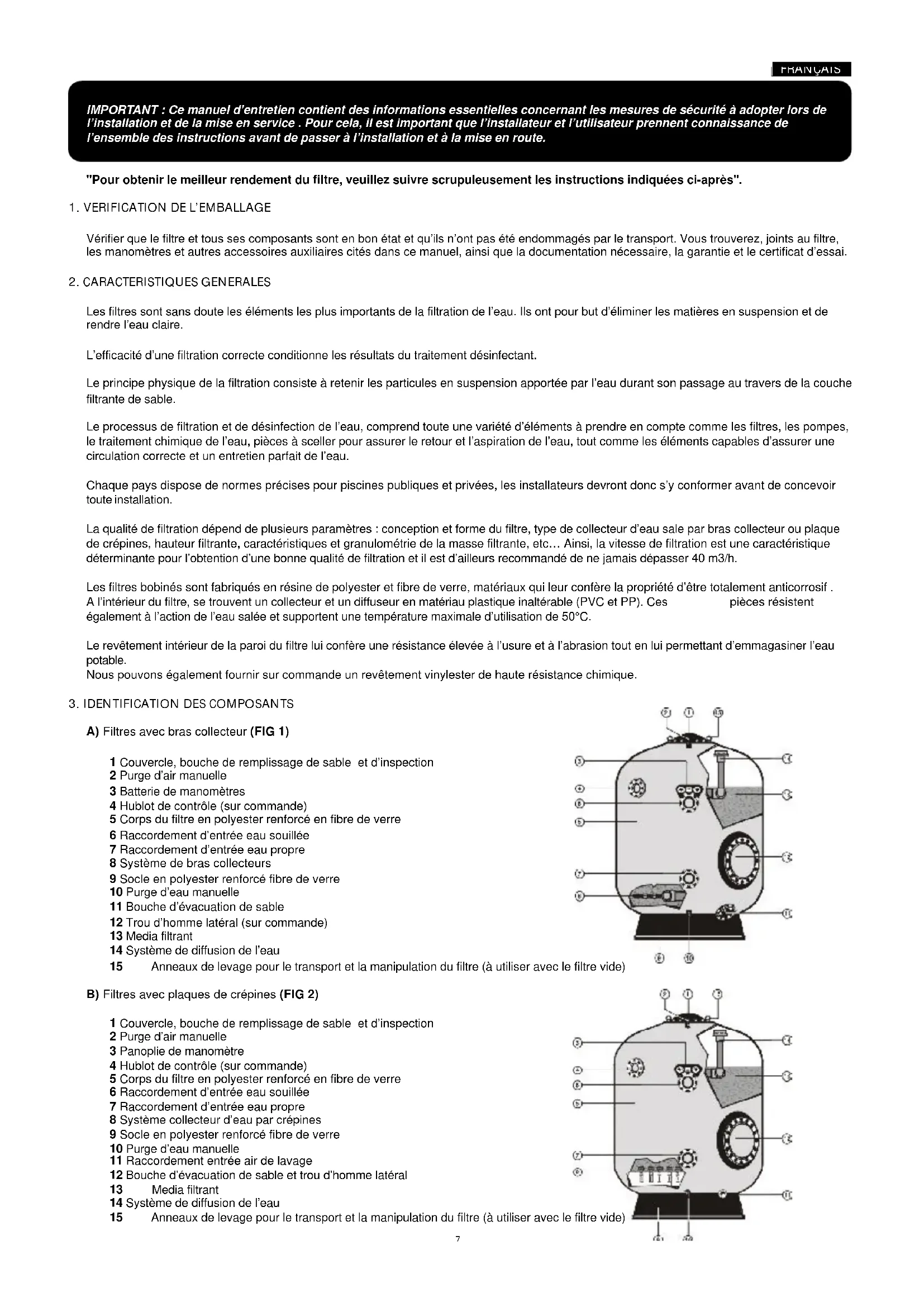 A) Filtres avec bras collecteur (FIG 1) 1 Couvercle, bouche de remplissage de sable et d’inspection 2 Purge d’air manuelle 3 Batterie de manomètres 4 Hublot de contrôle (sur commande) 5 Corps du filtre en polyester renforcé en fibre de verre 6 Raccordement d’entrée eau souillée 7 Raccordement d’entrée eau propre 8 Système de bras collecteurs 9 Socle en polyester renforcé fibre de verre 10 Purge d’eau manuelle 11 Bouche d’évacuation de sable 12 Trou d’homme latéral (sur commande) 13 Media filtrant 14 Système de diffusion de l’eau 15 Anneaux de levage pour le transport et la manipulation du filtre (à utiliser avec le filtre vide) B) Filtres avec plaques de crépines (FIG 2) 1 Couvercle, bouche de remplissage de sable et d’inspection 2 Purge d’air manuelle 3 Panoplie de manomètre 4 Hublot de contrôle (sur commande) 5 Corps du filtre en polyester renforcé en fibre de verre 6 Raccordement d’entrée eau souillée 7 Raccordement d’entrée eau propre 8 Système collecteur d’eau par crépines 9 Socle en polyester renforcé fibre de verre 10 Purge d’eau manuelle 11 Raccordement entrée air de lavage 12 Bouche d’évacuation de sable et trou d’homme latéral