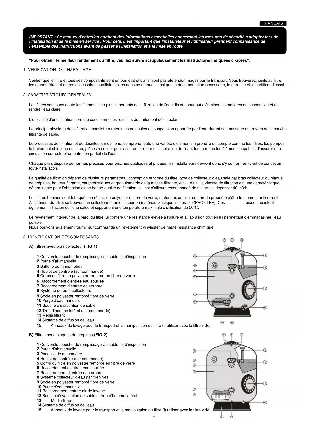 A) Filtres avec bras collecteur (FIG 1) 1 Couvercle, bouche de remplissage de sable et d’inspection 2 Purge d’air manuelle 3 Batterie de manomètres 4 Hublot de contrôle (sur commande) 5 Corps du filtre en polyester renforcé en fibre de verre 6 Raccordement d’entrée eau souillée 7 Raccordement d’entrée eau propre 8 Système de bras collecteurs 9 Socle en polyester renforcé fibre de verre 10 Purge d’eau manuelle 11 Bouche d’évacuation de sable 12 Trou d’homme latéral (sur commande) 13 Media filtrant 14 Système de diffusion de l’eau 15 Anneaux de levage pour le transport et la manipulation du filtre (à utiliser avec le filtre vide) B) Filtres avec plaques de crépines (FIG 2) 1 Couvercle, bouche de remplissage de sable et d’inspection 2 Purge d’air manuelle 3 Panoplie de manomètre 4 Hublot de contrôle (sur commande) 5 Corps du filtre en polyester renforcé en fibre de verre 6 Raccordement d’entrée eau souillée 7 Raccordement d’entrée eau propre 8 Système collecteur d’eau par crépines 9 Socle en polyester renforcé fibre de verre 10 Purge d’eau manuelle 11 Raccordement entrée air de lavage 12 Bouche d’évacuation de sable et trou d’homme latéral