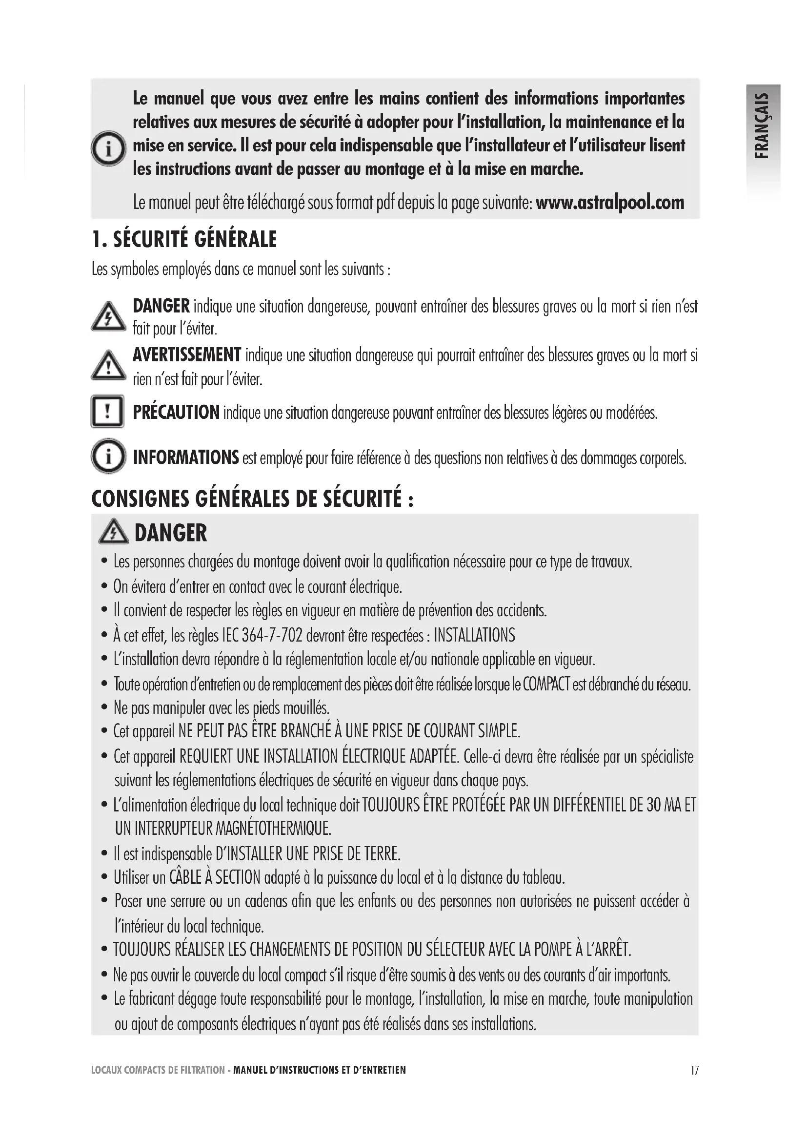 Les symboles employés dans ce manuel sont les suivants : DANGER indique une situation dangereuse, pouvant entraîner des blessures graves ou la mort si rien n’est fait pour l’éviter. AVERTISSEMENT indique une situation dangereuse qui pourrait entraîner des blessures graves ou la mort si rien n’est fait pour l’éviter. PRÉCAUTION indique une situation dangereuse pouvant entraîner des blessures légères ou modérées. INFORMATIONS est employé pour faire référence à des questions non relatives à des dommages corporels. Le manuel que vous avez entre les mains contient des informations importantes relatives aux mesures de sécurité à adopter pour l’installation, la maintenance et la mise en service. Il est pour cela indispensable que l’installateur et l’utilisateur lisent les instructions avant de passer au montage et à la mise en marche. Le manuel peut être téléchargé sous format pdf depuis la page suivante: www.astralpool.com DANGER