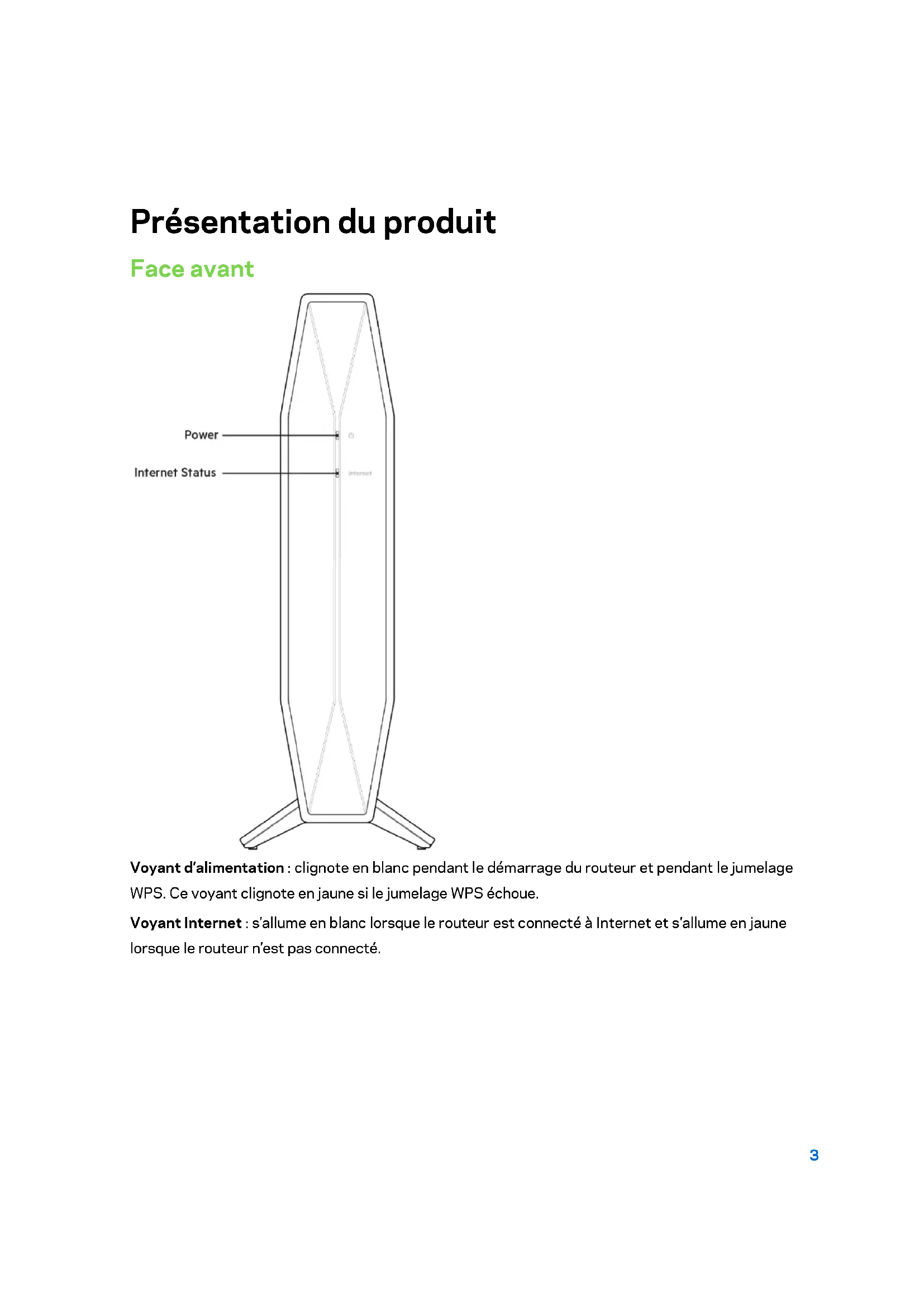 Attendez que le voyant d'alimentation blanc et les voyants Internet situés à l'avant du routeur cessent de clignoter et restent allumés. Cela peut prendre jusqu'à deux minutes. Ensuite, utilisez un ordinateur pour vous connecter à Internet.21 Spécifications Belkin RT3200 Nom du modèle Routeur Wi-Fi 6 Gigabit double bande AX3200 Référence du modèle RT3200 Vitesse des ports de commutateur 10 / 100 / 1000 Mbit/s (Gigabit Ethernet) Fréquence radio 2,4 GHz et 5 GHz Nombre d'antennes