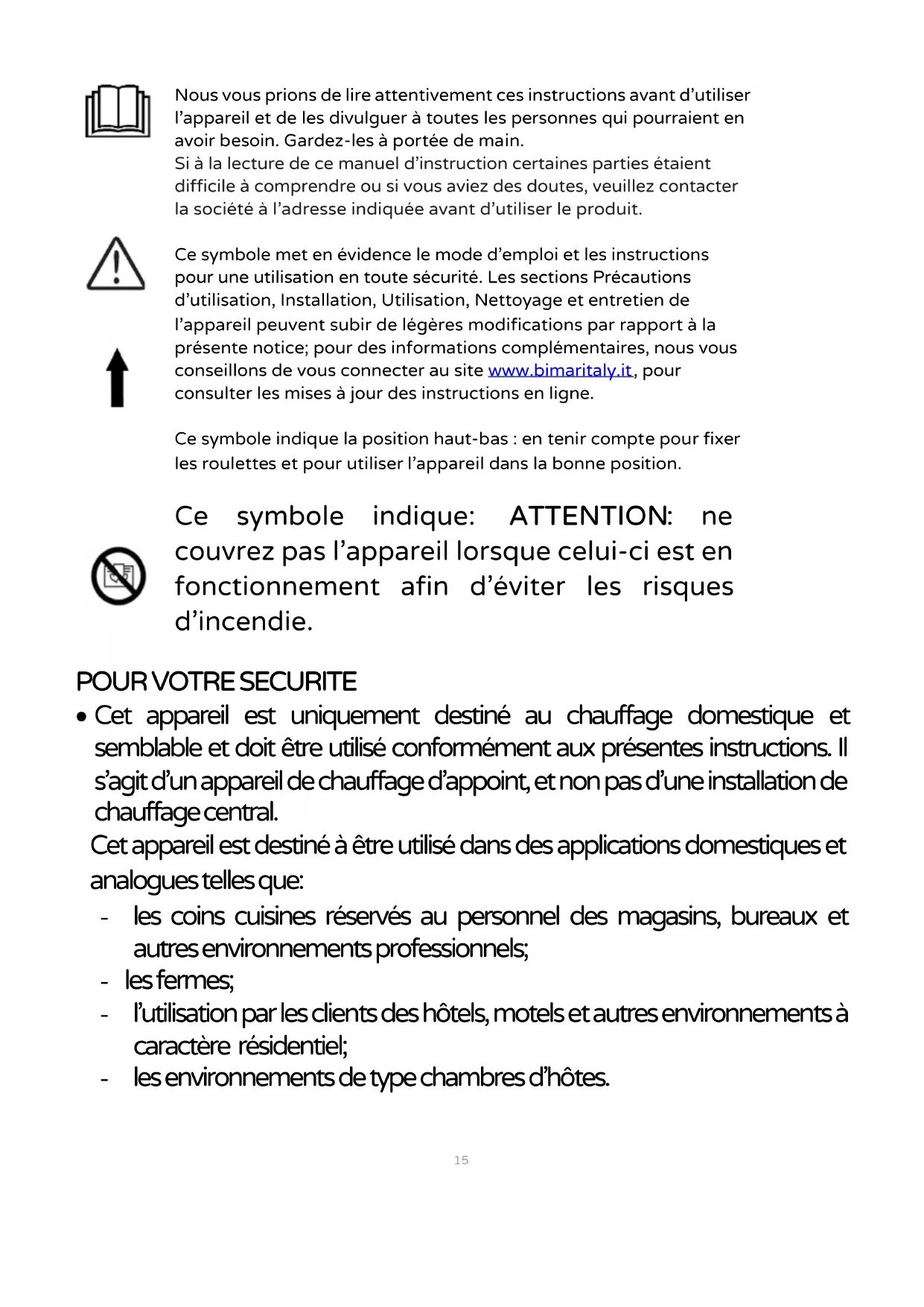 Nous vous prions de lire attentivement ces instructions avant d’utiliser l'appareil et de les divulguer à toutes les personnes qui pourraient en avoir besoin. Gardez-les à portée de main. Si à la lecture de ce manuel d'instruction certaines parties étaient difficile à comprendre ou si vous aviez des doutes, veuillez contacter la société à l'adresse indiquée avant d'utiliser le produit. Ce symbole met en évidence le mode d’emploi et les instructions pour une utilisation en toute sécurité. Les sections Précautions d’utilisation, Installation, Utilisation, Nettoyage et entretien de l’appareil peuvent subir de légères modifications par rapport à la présente notice; pour des informations complémentaires, nous vous conseillons de vous connecter au site www.bimaritaly.it , pour consulter les mises à jour des instructions en ligne. Ce symbole indique la position haut-bas : en tenir compte pour fixer les roulettes et pour utiliser l’appareil dans la bonne position. Ce symbole indique: ATTENTION : ne couvrez pas l’appareil lorsque celui-ci est en fonctionnement afin d’éviter les risques d’incendie.