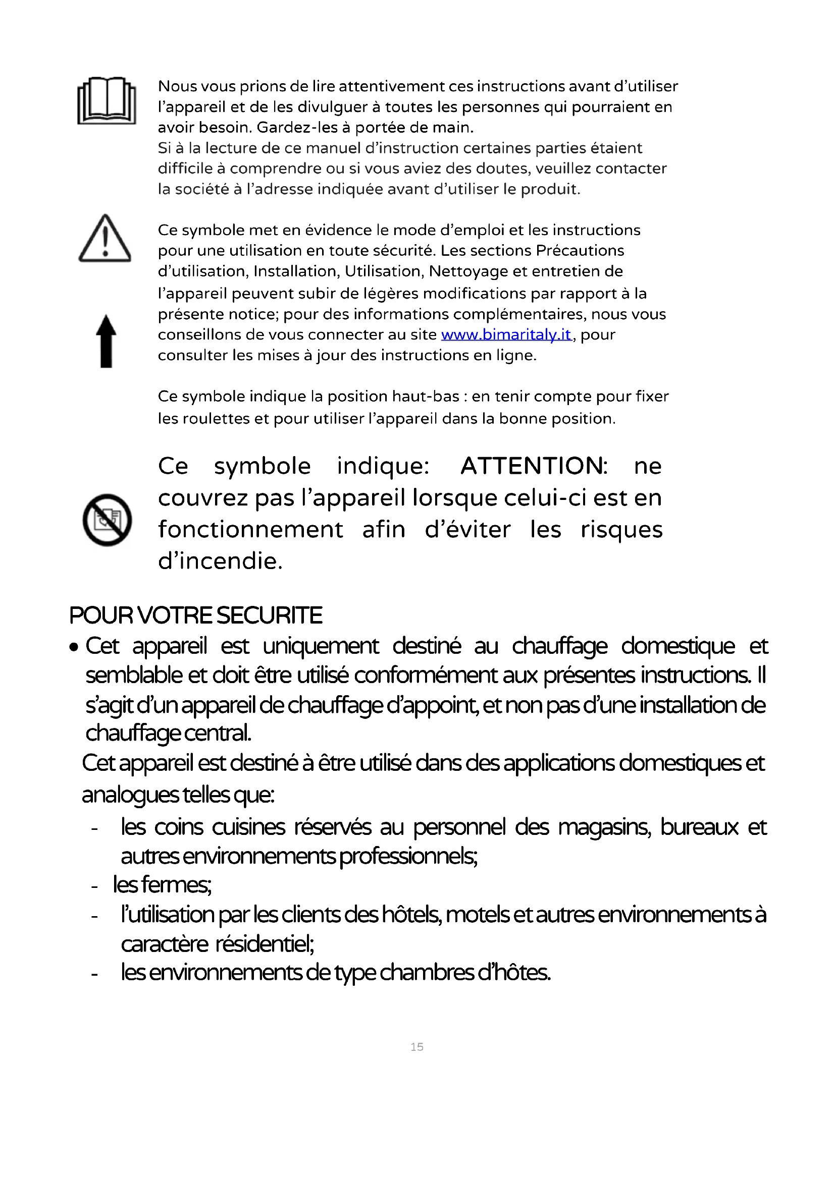Ce symbole met en évidence le mode d'emploi et les instructions pour une utilisation en toute sécurité. Les sections Précautions d'utilisation, Installation, Utilisation, Nettoyage et entretien de l'appareil peuvent subir de légères modifications par rapport à la présente notice ; pour des informations complémentaires, nous vous conseillons de vous connecter au site www.bimaritaly.it, pour consulter les mises à jour des instructions en ligne.