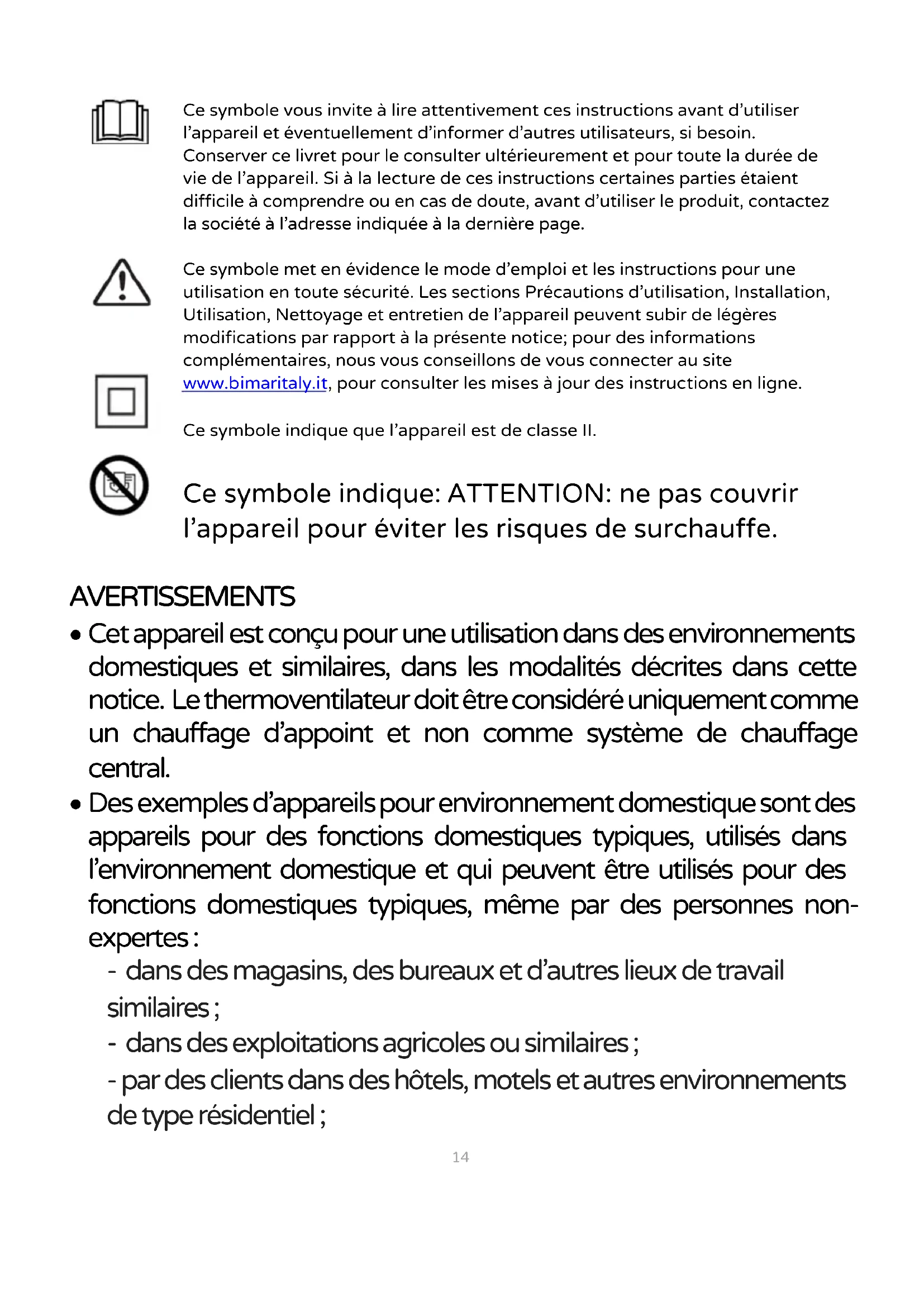 Ce symbole vous invite à lire attentivement ces instructions avant d'utiliser l'appareil et éventuellement d’informer d’autres utilisateurs, si besoin. Conserver ce livret pour le consulter ultérieurement et pour toute la durée de vie de l'appareil. Si à la lecture de ces instructions certaines parties étaient difficile à comprendre ou en cas de doute, avant d'utiliser le produit, contactez la société à l'adresse indiquée à la dernière page. Ce symbole met en évidence le mode d’emploi et les instructions pour une utilisation en toute sécurité. Les sections Précautions d’utilisation, Installation, Utilisation, Nettoyage et entretien de l’appareil peuvent subir de légères modifications par rapport à la présente notice; pour des informations complémentaires, nous vous conseillons de vous connecter au site www.bimaritaly.it, pour consulter les mises à jour des instructions en ligne.