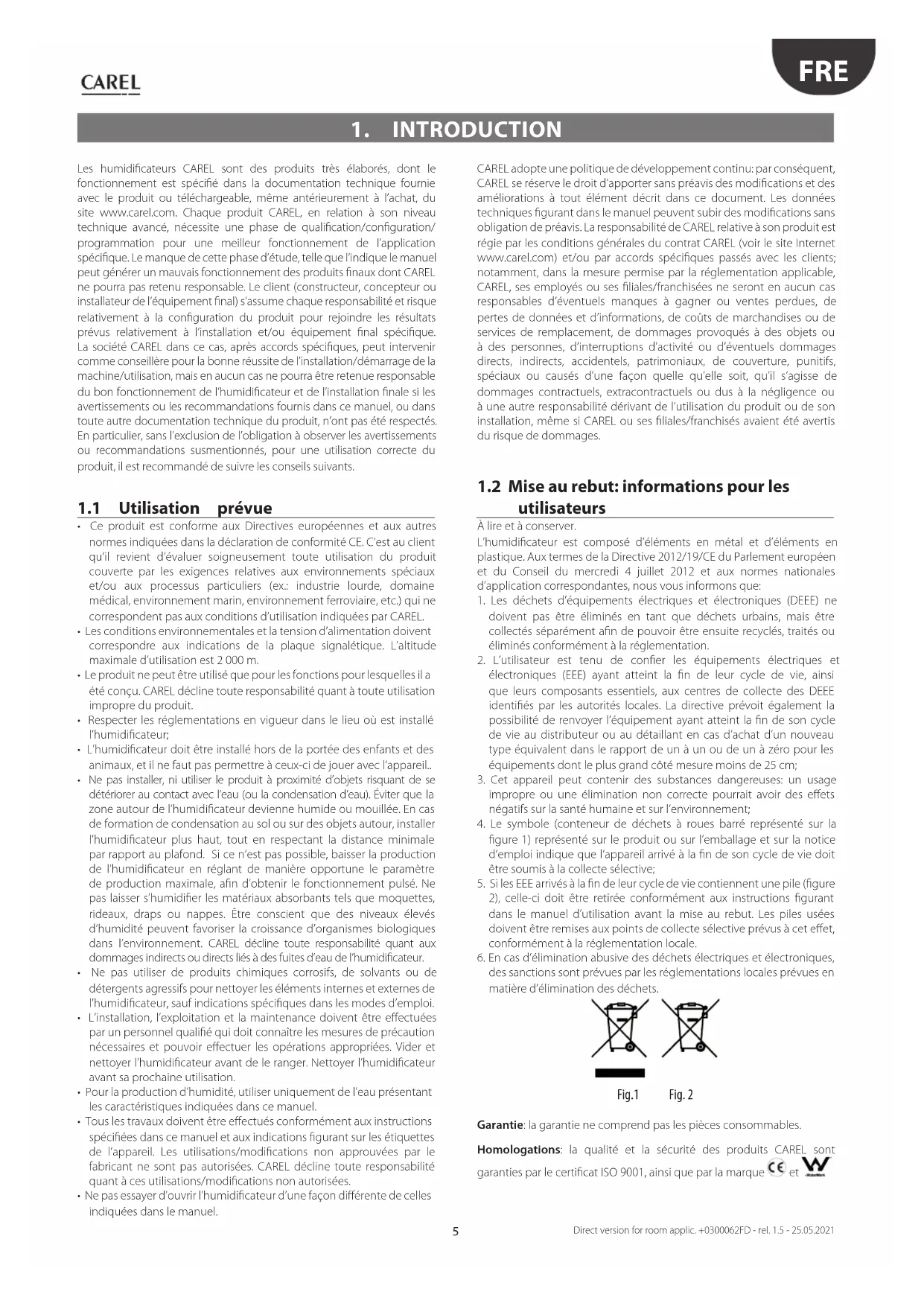 utilisateurs À lire et à conserver. L’humidificateur est composé d’éléments en métal et d’éléments en plastique. Aux termes de la Directive 2012/19/CE du Parlement européen et du Conseil du mercredi 4 juillet 2012 et aux normes nationales d’application correspondantes, nous vous informons que: 1. Les déchets d’équipements électriques et électroniques (DEEE) ne doivent pas être éliminés en tant que déchets urbains, mais être collectés séparément afin de pouvoir être ensuite recyclés, traités ou éliminés conformément à la réglementation. 2. L’utilisateur est tenu de confier les équipements électriques et électroniques (EEE) ayant atteint la fin de leur cycle de vie, ainsi que leurs composants essentiels, aux centres de collecte des DEEE identifiés par les autorités locales. La directive prévoit également la possibilité de renvoyer l’équipement ayant atteint la fin de son cycle de vie au distributeur ou au détaillant en cas d’achat d’un nouveau type équivalent dans le rapport de un à un ou de un à zéro pour les équipements dont le plus grand côté mesure moins de 25 cm; 3. Cet appareil peut contenir des substances dangereuses: un usage impropre ou une élimination non correcte pourrait avoir des effets négatifs sur la santé humaine et sur l’environnement; 4. Le symbole (conteneur de déchets à roues barré représenté sur la figure 1) représenté sur le produit ou sur l’emballage et sur la notice d’emploi indique que l’appareil arrivé à la fin de son cycle de vie doit être soumis à la collecte sélective; 5. Si les EEE arrivés à la fin de leur cycle de vie contiennent une pile (figure 2), celle-ci doit être retirée conformément aux instructions figurant dans le manuel d’utilisation avant la mise au rebut. Les piles usées doivent être remises aux points de collecte sélective prévus à cet effet, conformément à la réglementation locale. 6. En cas d’élimination abusive des déchets électriques et électroniques, des sanctions sont prévues par les réglementations locales prévues en matière d’élimination des déchets. Fig.1 Fig. 2 Garantie: la garantie ne comprend pas les pièces consommables. Homologations: la qualité et la sécurité des produits CAREL sont garanties par le certificat ISO 9001, ainsi que par la marque et .6 FRE Direct version for room applic. +0300062FD - rel. 1.5 - 25.05.2021