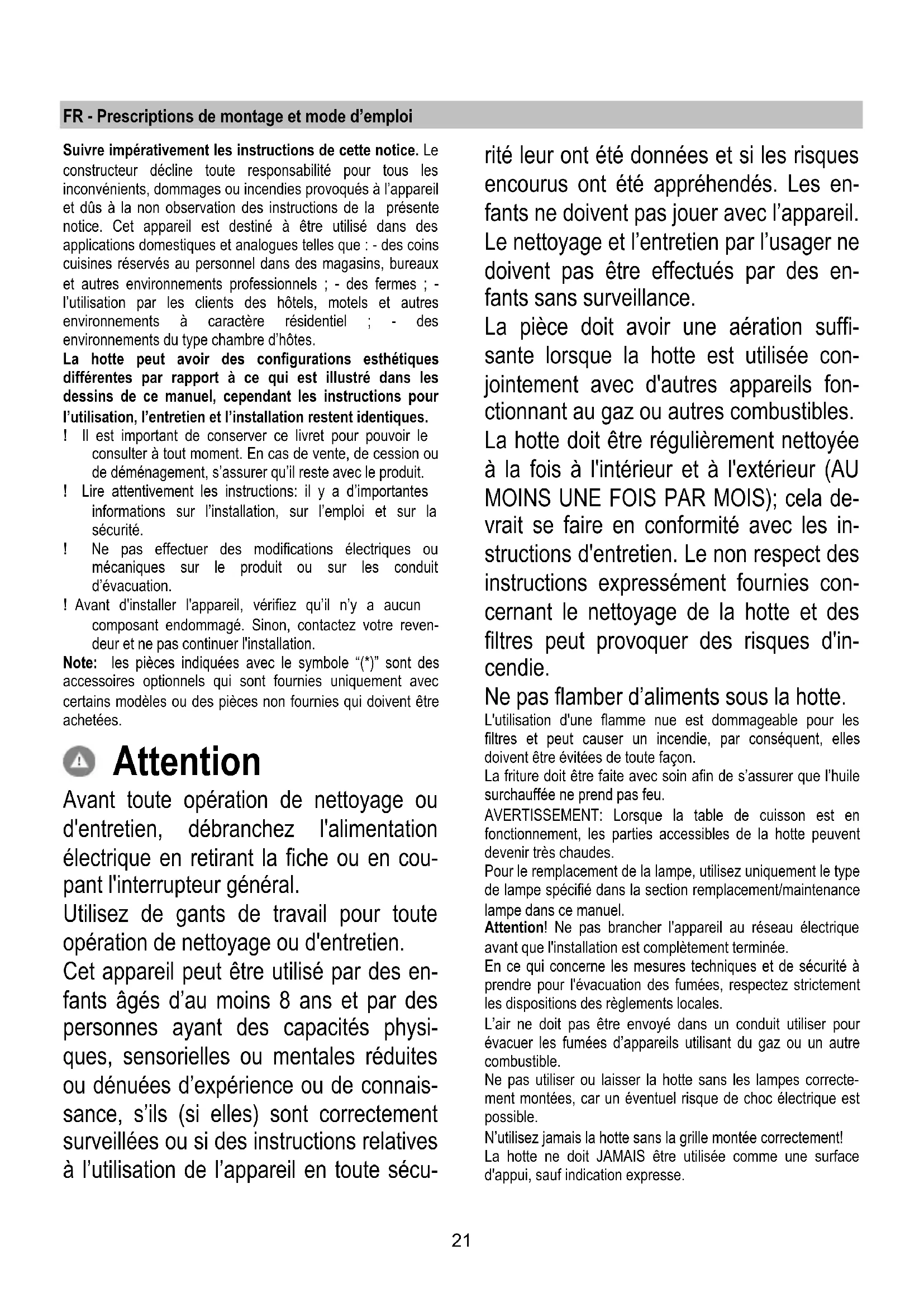 schluss). Sollte die Beleuchtung nicht funktionieren, erst kontrollieren, ob die Lampen einwandfrei eingesetzt sind, bevor man sich an den Kundendienst wendet.21 FR - Prescriptions de montage et mode d’emploi Suivre impérativement les instructions de cette notice. Le constructeur décline toute responsabilité pour tous les inconvénients, dommages ou incendies provoqués à l’appareil et dûs à la non observation des instructions de la présente notice. Cet appareil est destiné à être utilisé dans des applications domestiques et analogues telles que : - des coins cuisines réservés au personnel dans des magasins, bureaux et autres environnements professionnels ; - des fermes ; - l’utilisation par les clients des hôtels, motels et autres environnements à caractère résidentiel ; - des environnements du type chambre d’hôtes. La hotte peut avoir des configurations esthétiques différentes par rapport à ce qui est illustré dans les dessins de ce manuel, cependant les instructions pour l’utilisation, l’entretien et l’installation restent identiques. ! Il est important de conserver ce livret pour pouvoir le consulter à tout moment. En cas de vente, de cession ou de déménagement, s’assurer qu’il reste avec le produit. ! Lire attentivement les instructions: il y a d’importantes informations sur l’installation, sur l’emploi et sur la sécurité. ! Ne pas effectuer des modifications électriques ou mécaniques sur le produit ou sur les conduit d’évacuation. ! Avant d'installer l'appareil, vérifiez qu’il n’y a aucun composant endommagé. Sinon, contactez votre reven- deur et ne pas continuer l'installation. Note: les pièces indiquées avec le symbole “(*)” sont des accessoires optionnels qui sont fournies uniquement avec certains modèles ou des pièces non fournies qui doivent être achetées. Attention Avant toute opération de nettoyage ou d'entretien, débranchez l'alimentation électrique en retirant la fiche ou en cou- pant l'interrupteur général. Utilisez de gants de travail pour toute opération de nettoyage ou d'entretien. Cet appareil peut être utilisé par des en- fants âgés d’au moins 8 ans et par des personnes ayant des capacités physi- ques, sensorielles ou mentales réduites ou dénuées d’expérience ou de connais- sance, s’ils (si elles) sont correctement surveillées ou si des instructions relatives à l’utilisation de l’appareil en toute sécu- rité leur ont été données et si les risques encourus ont été appréhendés. Les en- fants ne doivent pas jouer avec l’appareil. Le nettoyage et l’entretien par l’usager ne doivent pas être effectués par des en- fants sans surveillance. La pièce doit avoir une aération suffi- sante lorsque la hotte est utilisée con- jointement avec d'autres appareils fon- ctionnant au gaz ou autres combustibles. La hotte doit être régulièrement nettoyée à la fois à l'intérieur et à l'extérieur (AU MOINS UNE FOIS PAR MOIS); cela de- vrait se faire en conformité avec les in- structions d'entretien. Le non respect des instructions expressément fournies con- cernant le nettoyage de la hotte et des filtres peut provoquer des risques d'in- cendie. Ne pas flamber d’aliments sous la hotte. L'utilisation d'une flamme nue est dommageable pour les filtres et peut causer un incendie, par conséquent, elles doivent être évitées de toute façon. La friture doit être faite avec soin afin de s’assurer que l’huile surchauffée ne prend pas feu.