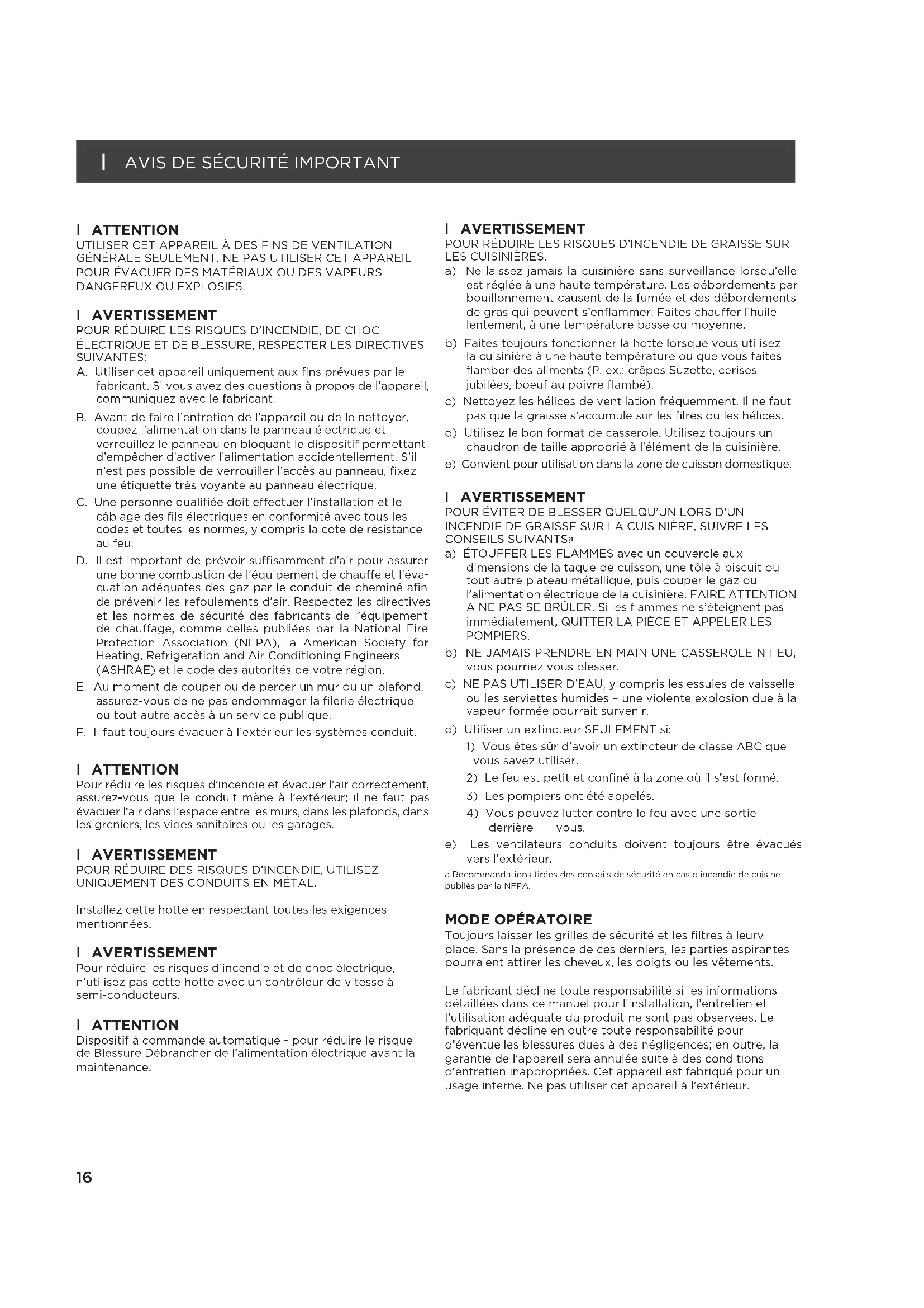 I ATTENTION UTILISER CET APPAREIL À DES FINS DE VENTILATIONGÉNÉRALE SEULEMENT. NE PAS UTILISER CET APPAREIL POUR ÉVACUER DES MATÉRIAUX OU DES VAPEURS DANGEREUX OU EXPLOSIFS. I AVERTISSEMENT POUR RÉDUIRE LES RISQUES D’INCENDIE, DE CHOC ÉLECTRIQUE ET DE BLESSURE, RESPECTER LES DIRECTIVES SUIVANTES:A. Utiliser cet appareil uniquement aux fins prévues par le fabricant. Si vous avez des questions à propos de l’appareil, communiquez avec le fabricant.B. Avant de faire l’entretien de l’appareil ou de le nettoyer, coupez l’alimentation dans le panneau électrique et verrouillez le panneau en bloquant le dispositif permettant d’empêcher d’activer l’alimentation accidentellement. S’il n’est pas possible de verrouiller l’accès au panneau, fixez une étiquette très voyante au panneau électrique.C. Une personne qualifiée doit eectuer l’installation et le câblage des fils électriques en conformité avec tous les codes et toutes les normes, y compris la cote de résistance au feu.D. Il est important de prévoir susamment d’air pour assurer une bonne combustion de l’équipement de chaue et l’éva-cuation adéquates des gaz par le conduit de cheminé afin de prévenir les refoulements d’air. Respectez les directives et les normes de sécurité des fabricants de l’équipement de chauage, comme celles publiées par la National Fire Protection Association (NFPA), la American Society for Heating, Refrigeration and Air Conditioning Engineers (ASHRAE) et le code des autorités de votre région.E. Au moment de couper ou de percer un mur ou un plafond, assurez-vous de ne pas endommager la filerie électrique ou tout autre accès à un service publique.F. Il faut toujours évacuer à l’extérieur les systèmes conduit. I ATTENTION Pour réduire les risques d’incendie et évacuer l’air correctement, assurez-vous que le conduit mène à l’extérieur; il ne faut pas évacuer l’air dans l’espace entre les murs, dans les plafonds, dans les greniers, les vides sanitaires ou les garages. I AVERTISSEMENT POUR RÉDUIRE DES RISQUES D’INCENDIE, UTILISEZ UNIQUEMENT DES CONDUITS EN MÉTAL.Installez cette hotte en respectant toutes les exigencesmentionnées. I AVERTISSEMENT Pour réduire les risques d’incendie et de choc électrique, n’utilisez pas cette hotte avec un contrôleur de vitesse à semi-conducteurs. I ATTENTION Dispositif à commande automatique - pour réduire le risque de Blessure Débrancher de l’alimentation électrique avant la maintenance. I AVERTISSEMENT POUR RÉDUIRE LES RISQUES D’INCENDIE DE GRAISSE SUR LES CUISINIÈRES.a) Ne laissez jamais la cuisinière sans surveillance lorsqu’elle est réglée à une haute température. Les débordements par bouillonnement causent de la fumée et des débordements de gras qui peuvent s’enflammer. Faites chauer l’huile lentement, à une température basse ou moyenne. b) Faites toujours fonctionner la hotte lorsque vous utilisez la cuisinière à une haute température ou que vous faites flamber des aliments (P. ex.: crêpes Suzette, cerises jubilées, boeuf au poivre flambé). c) Nettoyez les hélices de ventilation fréquemment. Il ne faut pas que la graisse s’accumule sur les filres ou les hélices.d) Utilisez le bon format de casserole. Utilisez toujours un chaudron de taille approprié à l’élément de la cuisinière.e) Convient pour utilisation dans la zone de cuisson domestique. I AVERTISSEMENT POUR ÉVITER DE BLESSER QUELQU’UN LORS D’UN INCENDIE DE GRAISSE SUR LA CUISINIÈRE, SUIVRE LES CONSEILS SUIVANTS: a) ÉTOUFFER LES FLAMMES avec un couvercle aux dimensions de la taque de cuisson, une tôle à biscuit ou tout autre plateau métallique, puis couper le gaz ou l’alimentation électrique de la cuisinière. FAIRE ATTENTION A NE PAS SE BRÛLER. Si les flammes ne s’éteignent pas immédiatement, QUITTER LA PIÈCE ET APPELER LES POMPIERS.b) NE JAMAIS PRENDRE EN MAIN UNE CASSEROLE N FEU, vous pourriez vous blesser.c) NE PAS UTILISER D’EAU, y compris les essuies de vaisselle ou les serviettes humides – une violente explosion due à la vapeur formée pourrait survenir.d) Utiliser un extincteur SEULEMENT si:1) Vous êtes sûr d’avoir un extincteur de classe ABC que vous savez utiliser.2) Le feu est petit et confiné à la zone où il s’est formé.3) Les pompiers ont été appelés.4) Vous pouvez lutter contre le feu avec une sortie derrière vous.e) Les ventilateurs conduits doivent toujours être évacués vers l’extérieur.a Recommandations tirées des conseils de sécurité en cas d’incendie de cuisine publiés par la NFPA.