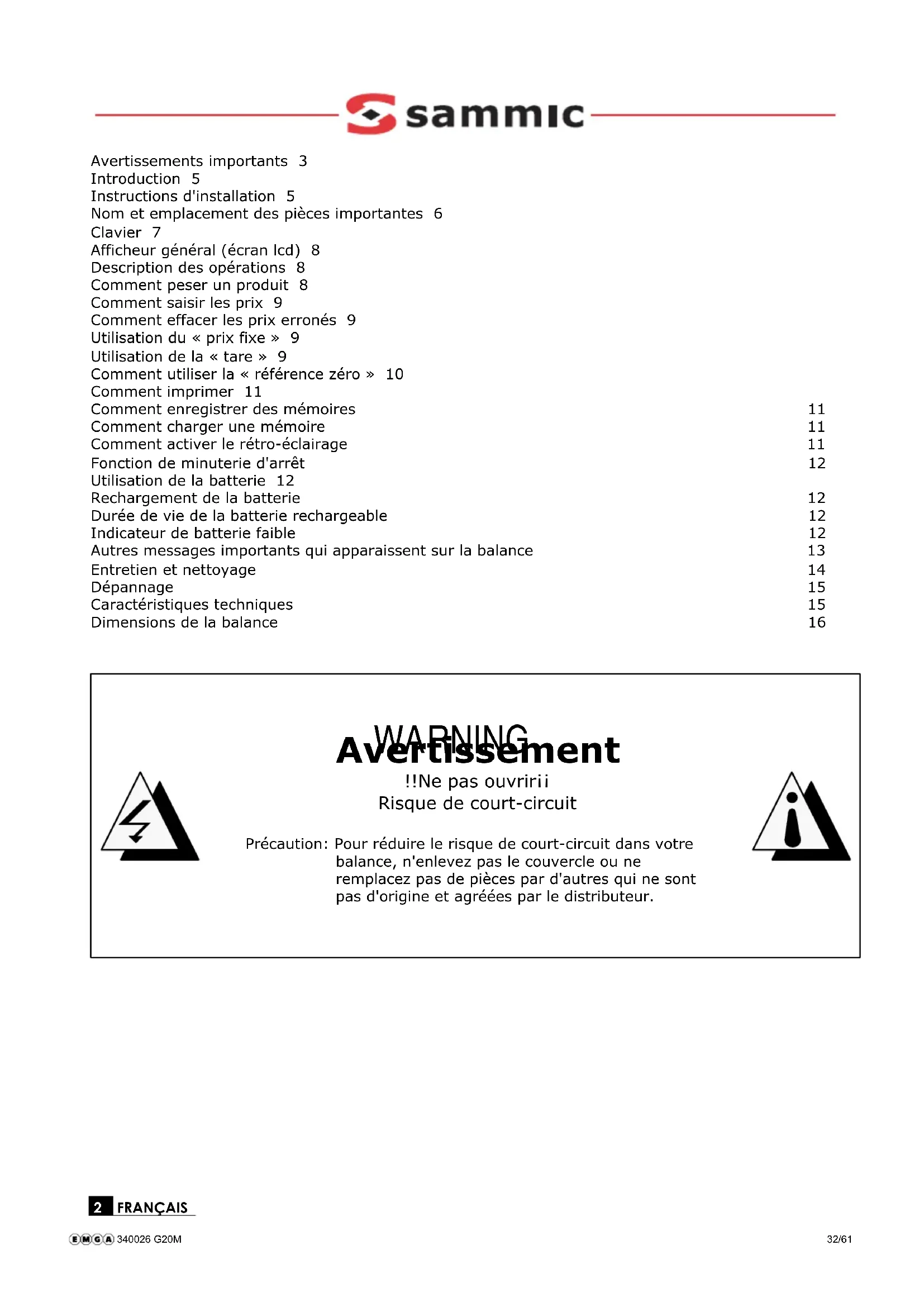 Avertissements importants 3Introduction 5Instructions d'installation 5Nom et emplacement des pièces importantes 6 Clavier 7Afficheur général (écran lcd) 8Description des opérations 8Comment peser un produit 8Comment saisir les prix 9Comment effacer les prix erronés 9Utilisation du « prix fixe » 9Utilisation de la « tare » 9Comment utiliser la « référence zéro » 10 Comment imprimer 11Comment enregistrer des mémoires 11 Comment charger une mémoire 11Comment activer le rétro-éclairage 11 Fonction de minuterie d'arrêt 12Utilisation de la batterie 12Rechargement de la batterie 12Durée de vie de la batterie rechargeable 12 Indicateur de batterie faible 12Autres messages importants qui apparaissent sur la balance 13 Entretien et nettoyage 14Dépannage 15Caractéristiques techniques 15Dimensions de la balance 16 WARNING