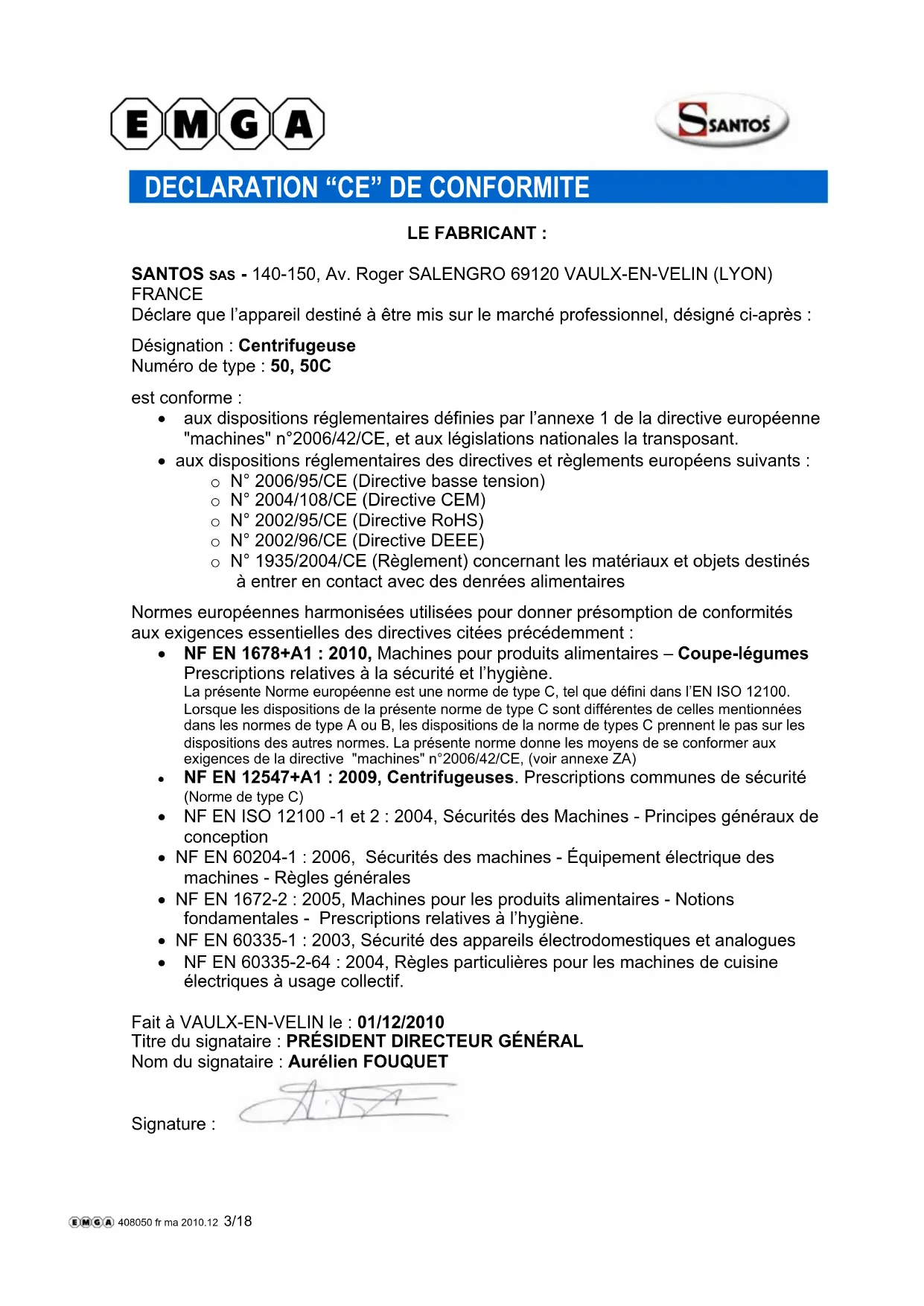 NF EN 12547+A1 : 2009, Centrifugeuses. Prescriptions communes de sécurité (Norme de type C) NF EN ISO 12100 -1 et 2 : 2004, Sécurités des Machines - Principes généraux de conception NF EN 60204-1 : 2006, Sécurités des machines - Équipement électrique des machines - Règles générales NF EN 1672-2 : 2005, Machines pour les produits alimentaires - Notions fondamentales - Prescriptions relatives à l’hygiène. NF EN 60335-1 : 2003, Sécurité des appareils électrodomestiques et analogues NF EN 60335-2-64 : 2004, Règles particulières pour les machines de cuisine électriques à usage collectif. Fait à VAULX-EN-VELIN le : 01/12/2010 Titre du signataire : PRÉSIDENT DIRECTEUR GÉNÉRAL Nom du signataire : Aurélien FOUQUET Signature : 408050 fr ma 2010.12 3/1898150 FR 4.3 - 12 2010 4/18 www.santos.fr