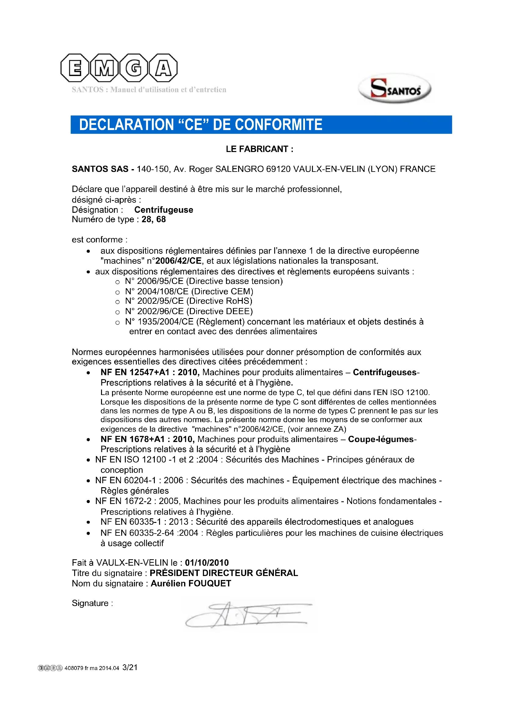 LE FABRICANT : SANTOS SAS - 140-150, Av. Roger SALENGRO 69120 VAULX-EN-VELIN (LYON) FRANCE Déclare que l’appareil destiné à être mis sur le marché professionnel, désigné ci-après : Désignation : Centrifugeuse Numéro de type : 28, 68 est conforme : aux dispositions réglementaires définies par l’annexe 1 de la directive européenne "machines" n°2006/42/CE, et aux législations nationales la transposant. aux dispositions réglementaires des directives et règlements européens suivants : o N° 2006/95/CE (Directive basse tension) o N° 2004/108/CE (Directive CEM) o N° 2002/95/CE (Directive RoHS) o N° 2002/96/CE (Directive DEEE) o N° 1935/2004/CE (Règlement) concernant les matériaux et objets destinés à entrer en contact avec des denrées alimentaires Normes européennes harmonisées utilisées pour donner présomption de conformités aux exigences essentielles des directives citées précédemment : NF EN 12547+A1 : 2010, Machines pour produits alimentaires – Centrifugeuses- Prescriptions relatives à la sécurité et à l’hygiène. La présente Norme européenne est une norme de type C, tel que défini dans l’EN ISO 12100. Lorsque les dispositions de la présente norme de type C sont différentes de celles mentionnées dans les normes de type A ou B, les dispositions de la norme de types C prennent le pas sur les dispositions des autres normes. La présente norme donne les moyens de se conformer aux exigences de la directive "machines" n°2006/42/CE, (voir annexe ZA) NF EN 1678+A1 : 2010, Machines pour produits alimentaires – Coupe-légumes- Prescriptions relatives à la sécurité et à l’hygiène NF EN ISO 12100 -1 et 2 :2004 : Sécurités des Machines - Principes généraux de conception NF EN 60204-1 : 2006 : Sécurités des machines - Équipement électrique des machines - Règles générales NF EN 1672-2 : 2005, Machines pour les produits alimentaires - Notions fondamentales - Prescriptions relatives à l’hygiène. NF EN 60335-1 : 2013 : Sécurité des appareils électrodomestiques et analogues NF EN 60335-2-64 :2004 : Règles particulières pour les machines de cuisine électriques à usage collectif Fait à VAULX-EN-VELIN le : 01/10/2010 Titre du signataire : PRÉSIDENT DIRECTEUR GÉNÉRAL Nom du signataire : Aurélien FOUQUET Signature : 408079 fr ma 2014.04 3/21SANTOS : Manuel d'utilisation et d’entretien 98168 FR 1.0 - 12 2013 4 / 21 www.santos.fr