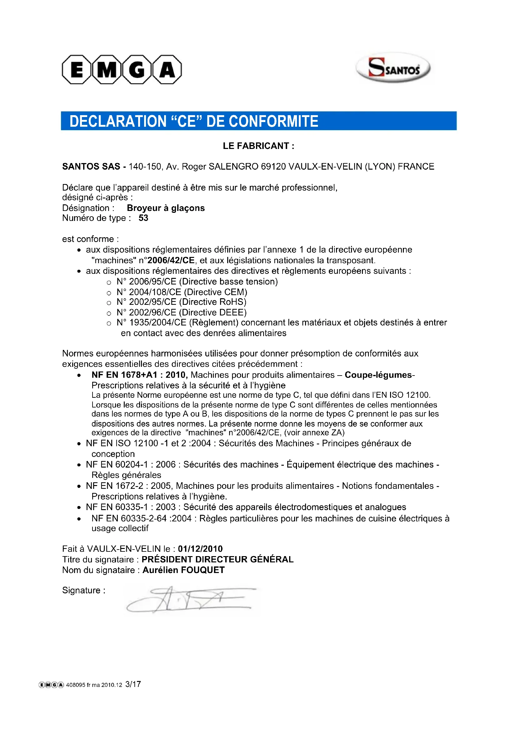 LE FABRICANT : SANTOS SAS - 140-150, Av. Roger SALENGRO 69120 VAULX-EN-VELIN (LYON) FRANCE Déclare que l’appareil destiné à être mis sur le marché professionnel, désigné ci-après : Désignation : Broyeur à glaçons Numéro de type : 53 est conforme : aux dispositions réglementaires définies par l’annexe 1 de la directive européenne "machines" n°2006/42/CE, et aux législations nationales la transposant. aux dispositions réglementaires des directives et règlements européens suivants : o N° 2006/95/CE (Directive basse tension) o N° 2004/108/CE (Directive CEM) o N° 2002/95/CE (Directive RoHS) o N° 2002/96/CE (Directive DEEE) o N° 1935/2004/CE (Règlement) concernant les matériaux et objets destinés à entrer en contact avec des denrées alimentaires Normes européennes harmonisées utilisées pour donner présomption de conformités aux exigences essentielles des directives citées précédemment : NF EN 1678+A1 : 2010, Machines pour produits alimentaires – Coupe-légumes- Prescriptions relatives à la sécurité et à l’hygiène La présente Norme européenne est une norme de type C, tel que défini dans l’EN ISO 12100. Lorsque les dispositions de la présente norme de type C sont différentes de celles mentionnées dans les normes de type A ou B, les dispositions de la norme de types C prennent le pas sur les dispositions des autres normes. La présente norme donne les moyens de se conformer aux exigences de la directive "machines" n°2006/42/CE, (voir annexe ZA) NF EN ISO 12100 -1 et 2 :2004 : Sécurités des Machines - Principes généraux de conception NF EN 60204-1 : 2006 : Sécurités des machines - Équipement électrique des machines - Règles générales NF EN 1672-2 : 2005, Machines pour les produits alimentaires - Notions fondamentales - Prescriptions relatives à l’hygiène. NF EN 60335-1 : 2003 : Sécurité des appareils électrodomestiques et analogues NF EN 60335-2-64 :2004 : Règles particulières pour les machines de cuisine électriques à usage collectif Fait à VAULX-EN-VELIN le : 01/12/2010 Titre du signataire : PRÉSIDENT DIRECTEUR GÉNÉRAL Nom du signataire : Aurélien FOUQUET Signature : 408095 fr ma 2010.12 3/1798153 FR 3.2 -12 2010 5 / 18 www.santos.fr