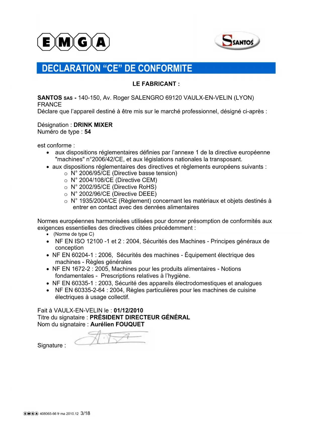 LE FABRICANT : SANTOS SAS - 140-150, Av. Roger SALENGRO 69120 VAULX-EN-VELIN (LYON) FRANCE Déclare que l’appareil destiné à être mis sur le marché professionnel, désigné ci-après : Désignation : DRINK MIXER Numéro de type : 54 est conforme : aux dispositions réglementaires définies par l’annexe 1 de la directive européenne "machines" n°2006/42/CE, et aux législations nationales la transposant. aux dispositions réglementaires des directives et règlements européens suivants : o N° 2006/95/CE (Directive basse tension) o N° 2004/108/CE (Directive CEM) o N° 2002/95/CE (Directive RoHS) o N° 2002/96/CE (Directive DEEE) o N° 1935/2004/CE (Règlement) concernant les matériaux et objets destinés à entrer en contact avec des denrées alimentaires Normes européennes harmonisées utilisées pour donner présomption de conformités aux exigences essentielles des directives citées précédemment : (Norme de type C) NF EN ISO 12100 -1 et 2 : 2004, Sécurités des Machines - Principes généraux de conception NF EN 60204-1 : 2006, Sécurités des machines - Équipement électrique des machines - Règles générales NF EN 1672-2 : 2005, Machines pour les produits alimentaires - Notions fondamentales - Prescriptions relatives à l’hygiène. NF EN 60335-1 : 2003, Sécurité des appareils électrodomestiques et analogues NF EN 60335-2-64 : 2004, Règles particulières pour les machines de cuisine électriques à usage collectif. Fait à VAULX-EN-VELIN le : 01/12/2010 Titre du signataire : PRÉSIDENT DIRECTEUR GÉNÉRAL Nom du signataire : Aurélien FOUQUET Signature : 408065-66 fr ma 2010.12 3/1898154 FR 2.2 - 12 2010 4 / 18 www.santos.fr